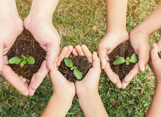 Multikulturelle Hände von Kindern und Erwachsenen halten junge Pflanzen über grünes Gras