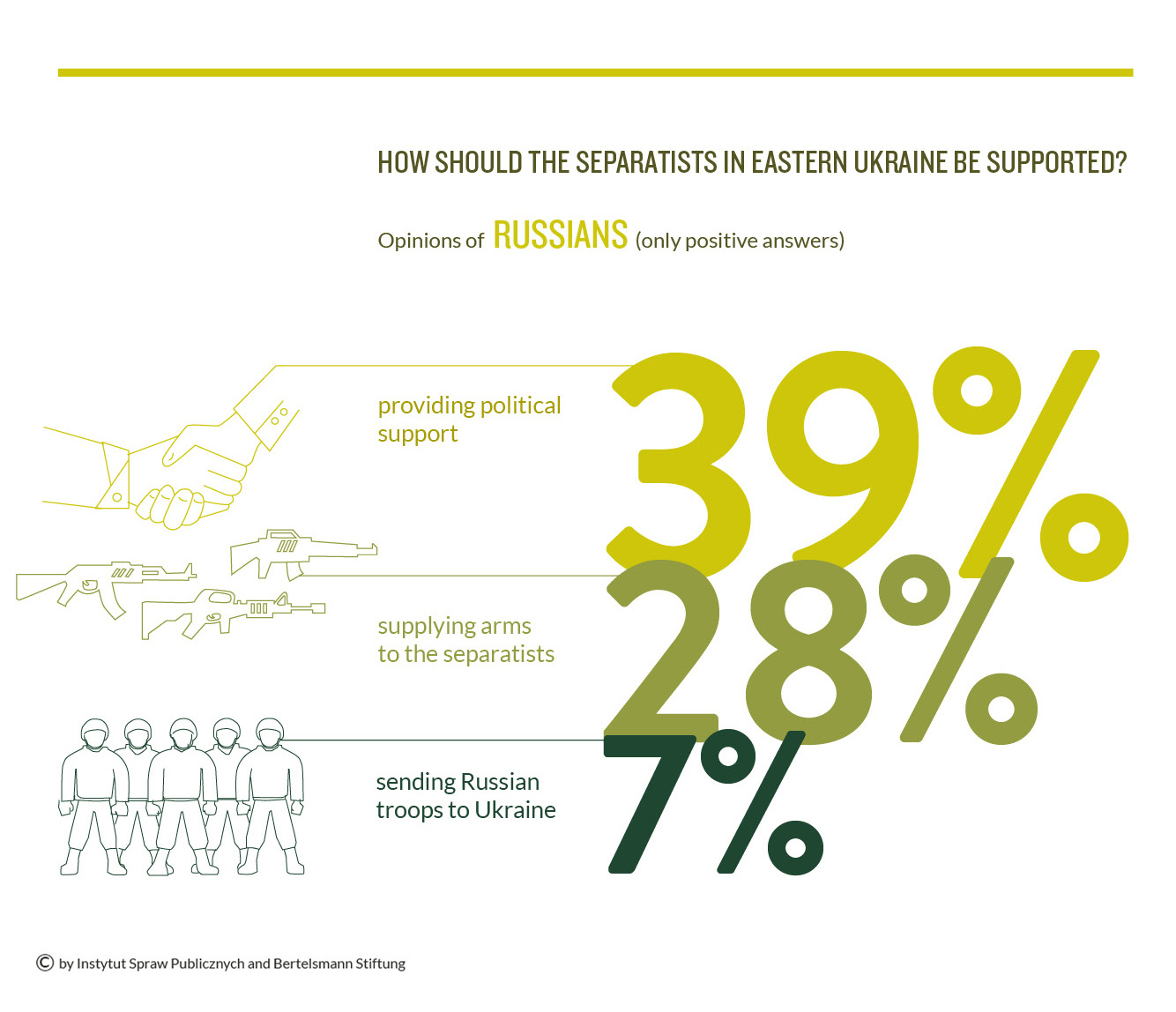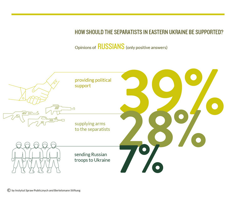 Geht es nach 39 Prozent der Russen, sollte sich die Unterstützung ihres Landes für die Separatisten im Osten der Ukraine auf politische Unterstützung beschränken. Deutlich weniger Befragte befürworten Waffenlieferungen. Nur eine kleine Minderheit spricht sich für die Entsendung russischer Truppen in die Ukraine aus.