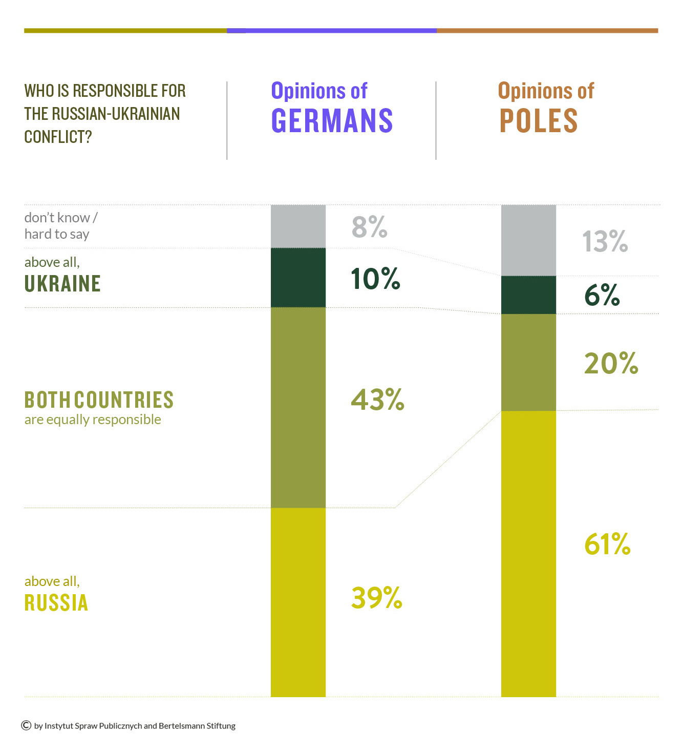 Unterschiede gibt es dagegen bei der Frage, wer Schuld am Ukraine-Konflikt trägt. Während eine relative Mehrheit der Deutschen mehrheitlich sowohl Russland als auch die Ukraine als Verantwortliche betrachtet, sehen die meisten Polen die Schuld allein bei Russland.