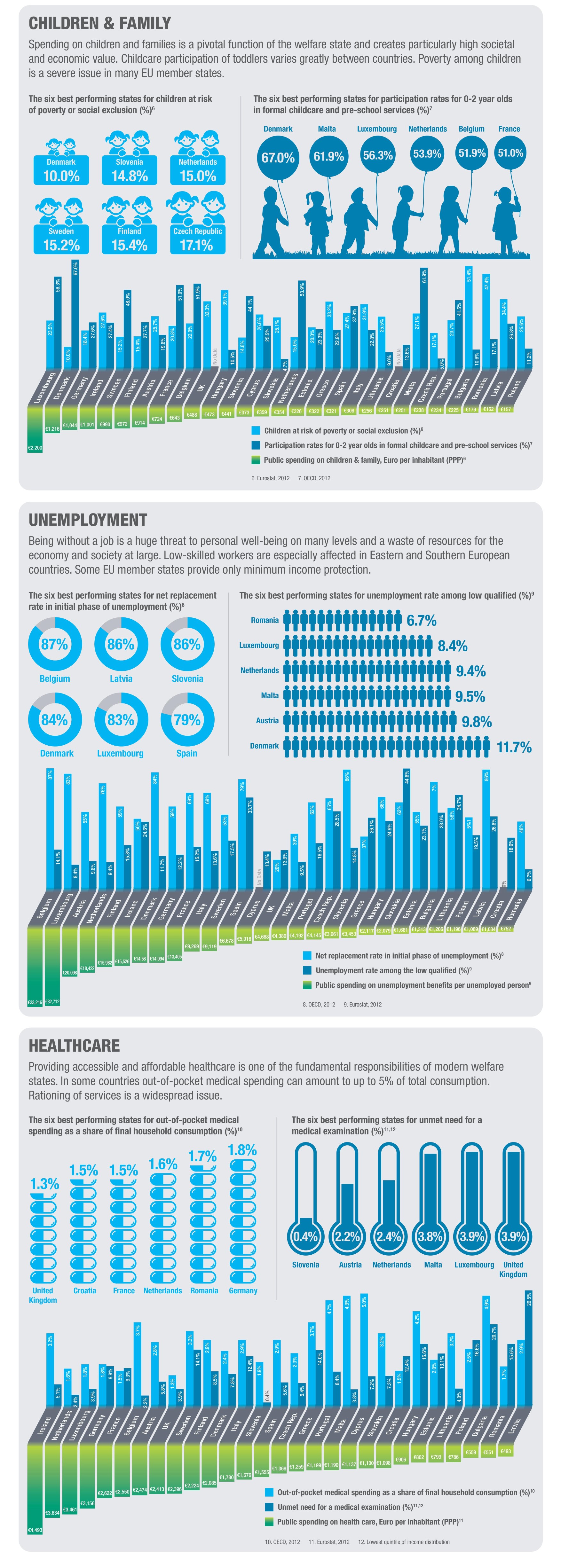 Unsere Infografik gibt einen Überblick über fünf Bereiche europäischer Sozialpolitik: Rente, Bildung und Ausbildung, Familie und Kinder, Arbeitslosigkeit und Gesundheitsversorgung (in Englisch).
