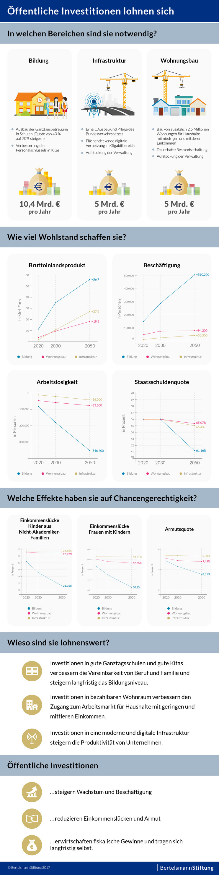 Straßen und Schulen bröckeln und es fehlen bezahlbarer Wohnraum und schnelle Internetleitungen – und das, obwohl die Konjunktur in Deutschland brummt. Entsprechend laut sind die Rufe nach höheren öffentlichen Investitionen. Doch in welche Bereiche sollte der Staat investieren und was bringt es? Eine Infografik zur Studie vom 07.11.2017.