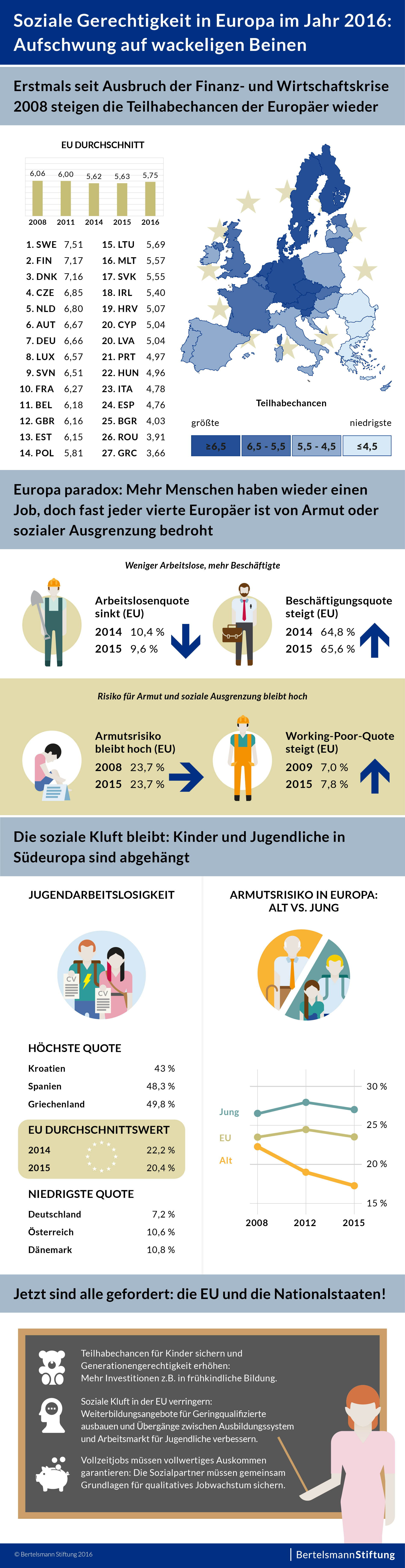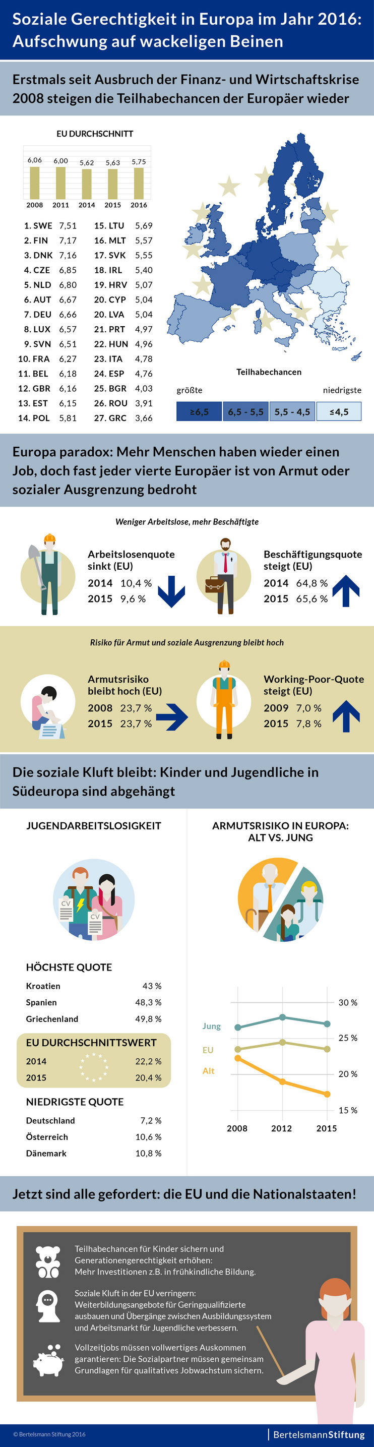 Infografik: Soziale Gerechtigkeit in Europa 2016: Aufschwung auf wackeligen Beinen Arbeitslosigkeit, Armut, Teilhabe - wir haben das Thema soziale Gerechtigkeit in Europa unter die Lupe genommen. Infografik zu einer Studie vom 14.11.2016. Teilen Drucken Infografik zu einer Studie vom 14.11.2016 Bertelsmann Stiftung
