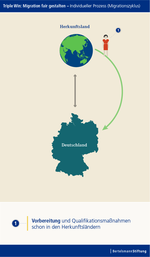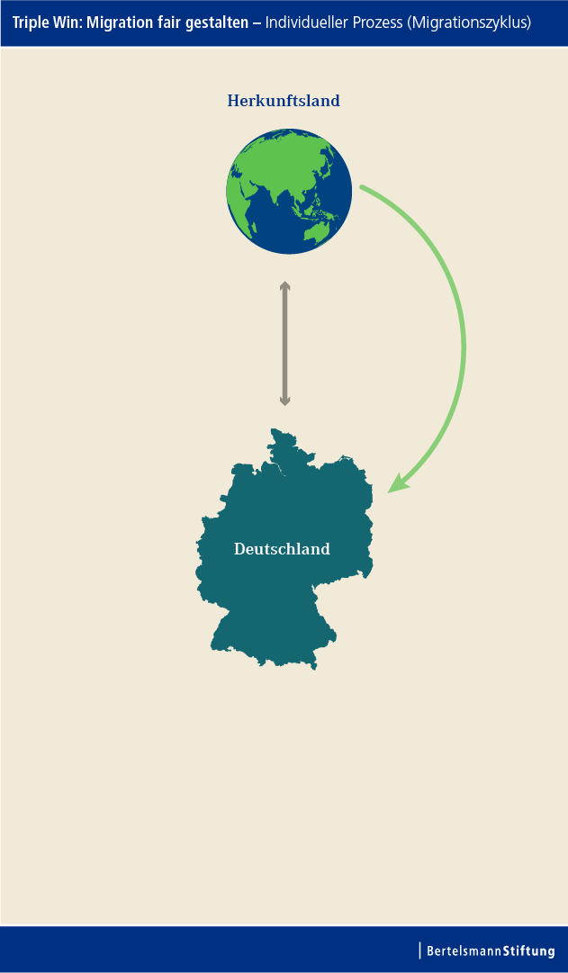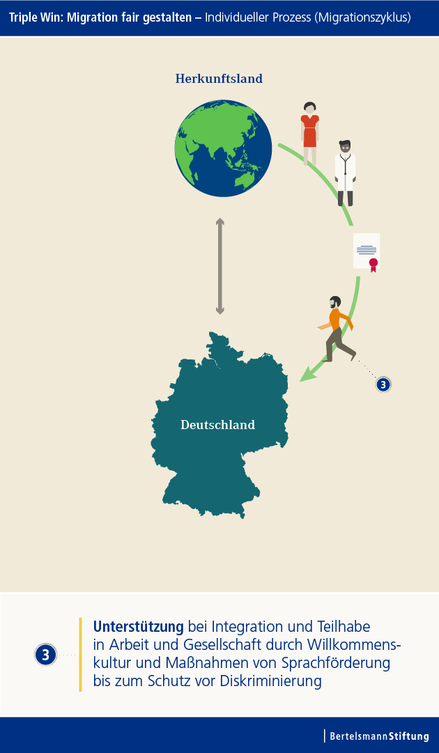 Im Idealfall werden Migranten schon im Herkunftsland mit Informations- und Qualifikationsmaßnahmen auf die Einwanderung in Deutschland vorbereitet. Schon vor der Einreise werden Qualifikationen und Abschlüsse von Migranten anerkannt. In Deutschland werden die Einwanderer bei der Integration in Arbeit und Gesellschaft unterstützt mit dem Ziel, ihre Teilhabe zu ermöglichen. Erforderlich ist dafür eine Willkommenskultur, die nicht nur eine Haltung der Offenheit für Einwanderer meint, sondern umfangreiche Maßnahmen von der Sprachförderung bis zum Schutz vor Diskriminierung umfasst.