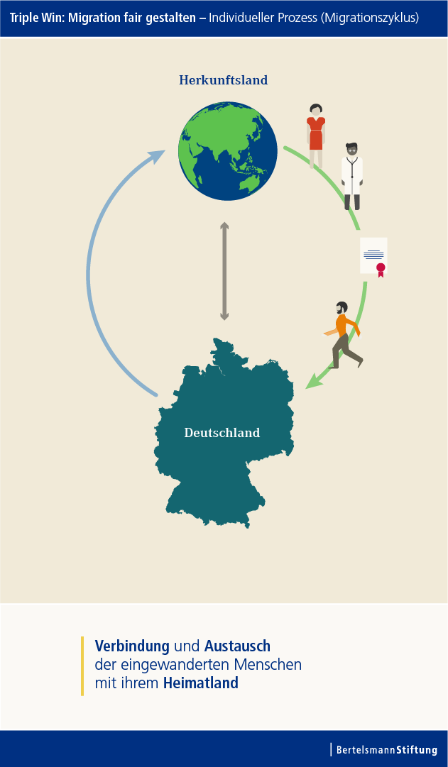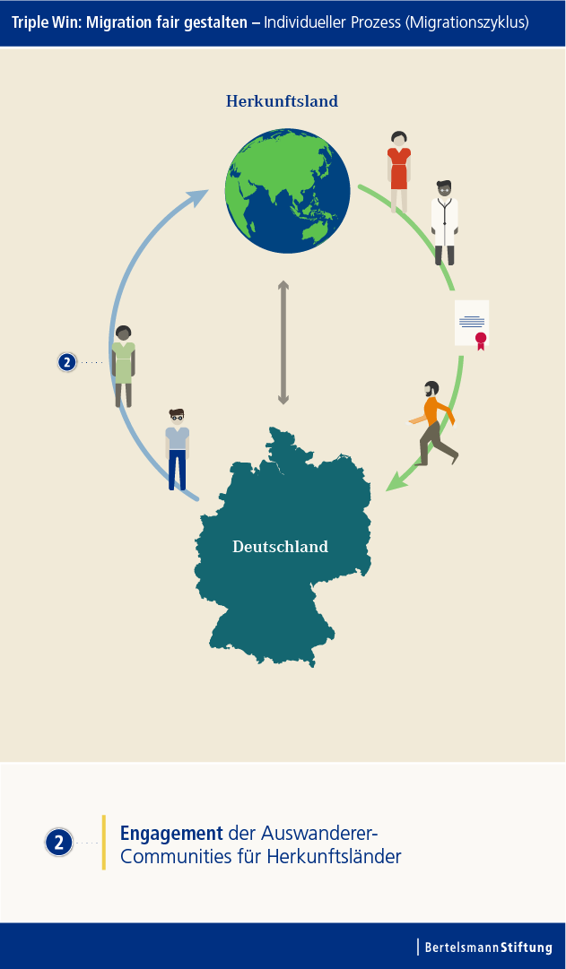 Die Verbindung und der Austausch der eingewanderten Menschen mit ihrem Heimatland sind ebenfalls wichtig. Wenn Wissen und Geld den Weg zurück nach Hause finden, fördert dies die Entwicklung vor Ort. Die Communities der Auswanderer können sich für ihre Herkunftsländer engagieren. Und eine freiwillige Rückkehr von Migranten kann durch den Transfer von erworbenen Erfahrungen und Kompetenzen ebenfalls positive Wirkungen für Herkunftsländer entfalten.