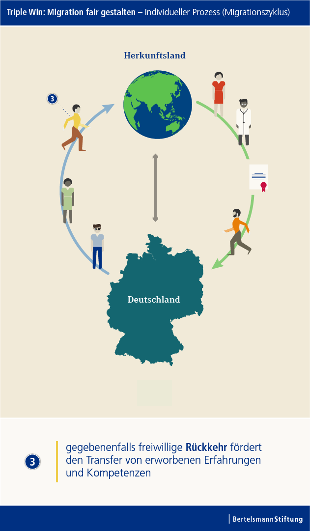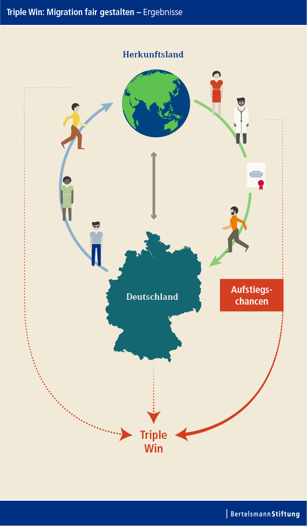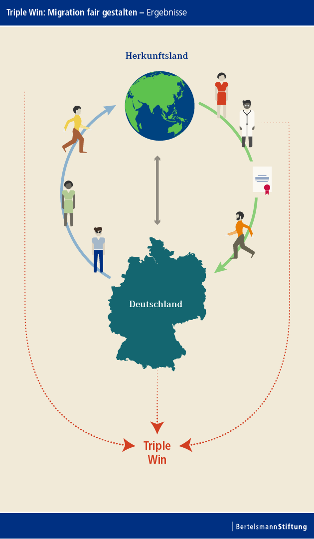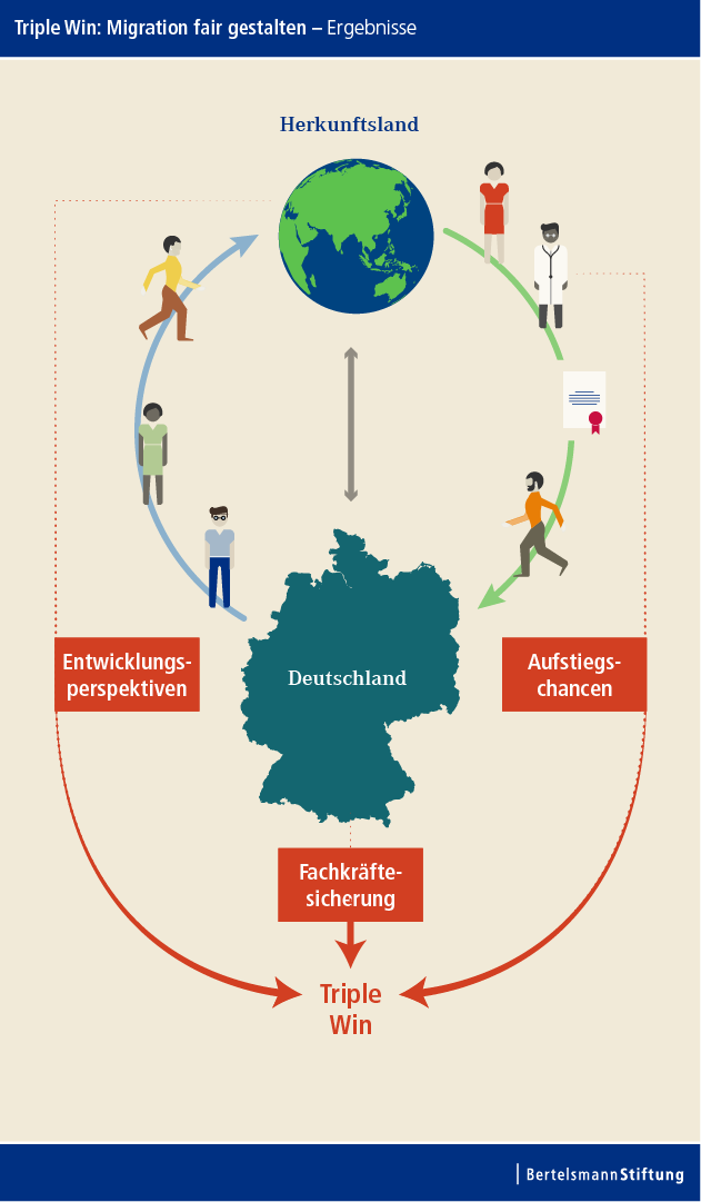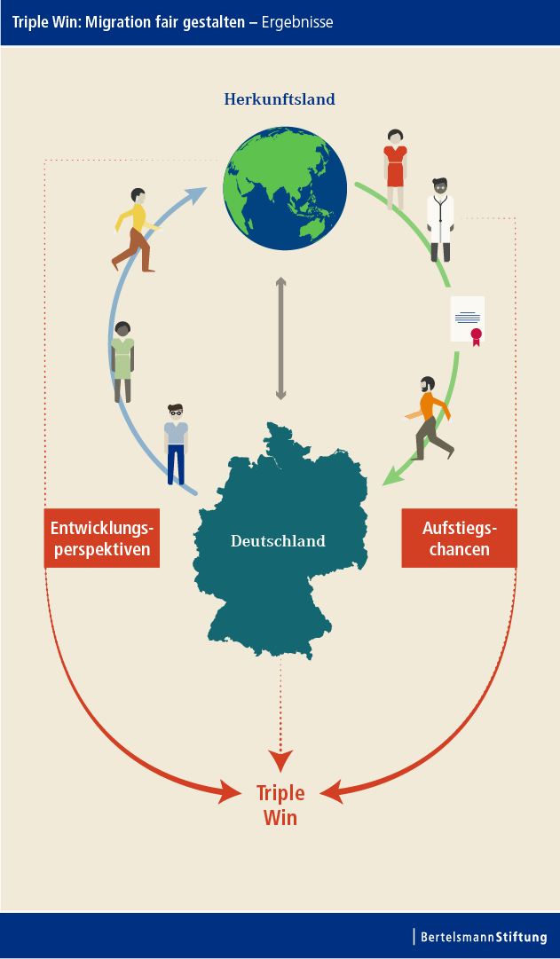 Im Ergebnis ergibt sich eine Triple Win Situation, wenn Migration in dieser Form gelingt. Es gewinnen also alle drei Beteiligten Gruppen: Die Migranten selbst, weil sie eine echte Chance auf Eingliederung, Arbeit und Karriere bekommen; die Herkunftsländer, weil sich für sie Entwicklungsperspektiven eröffnen, und für Deutschland selbst, das seinen Fachkräftebedarf sichern kann. Das ist der Triple Win der fairen Migration.
