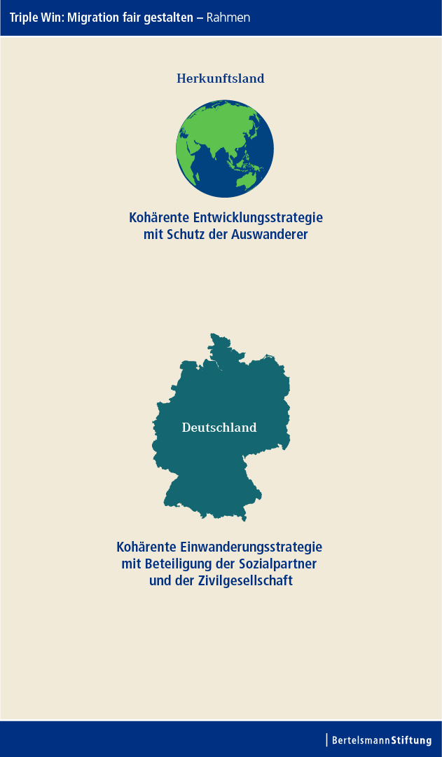 Der Rahmen für faire Migration ist in den Herkunftsländern eine kohärente Entwicklungsstrategie, die Auswanderer schützt. In Deutschland braucht es eine kohärente Einwanderungsstrategie, an der Sozialpartner und Zivilgesellschaft mitwirken. Zum Rahmen für faire Migration gehören bilaterale Abkommen zwischen Herkunfts- und Einwanderungsländern und die multilaterale Kooperation in der Staatengemeinschaft, um Entwicklung durch Migration zu fördern.
