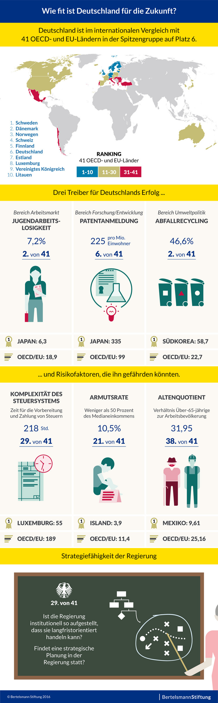 Infografik: Wie fit ist Deutschland für die Zukunft? Im internationalen Vergleich mit 41 OECD-Staaten ist Deutschland in mehrerer Hinsicht gut aufgestellt. Doch es gibt auch Nachholbedarf wie unsere Infografik zu einer Studie vom 18.8.2016 zeigt. Teilen Drucken Infografik zu einer Studie vom 18.8.2016