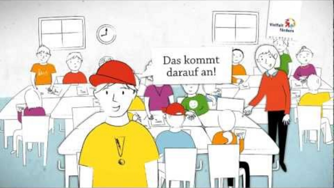 Die Vielfalt der Schüler rückt immer deutlicher in den Fokus der Aufmerksamkeit: Schulen sollen es schaffen, allen Kindern und Jugendlichen ein besseres Lernen mit starken Leistungen zu ermöglichen. Aber wie können Lehrkräfte konstruktiv mit der Vielfalt im Klassenzimmer umgehen? Schulen und Lehrkräfte brauchen Unterstützung in ihrem Bemühen, im Unterricht alle Kinder optimal zu fördern, damit diese ihr ganzes Potenzial entfalten können. Darum gibt es das Kooperationsprojekt „Vielfalt fördern“.Dieser Animationsfilm gibt in ca. 2,5 min einen ersten Überblick über die zentralen Anliegen und Inhalte des Projekts „Vielfalt fördern“.