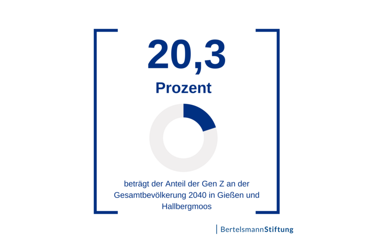 Wo leben junge Menschen - die Generation Z - jetzt und zukünftig? Mit 20,3 Prozent wird der Anteil der Gen Z (zwischen 1996 und 2009 geboren) bis 2040 in Gießen und Hallbergmoos besonders hoch sein. In Kleinmachnow dagegen wird der Anteil nur etwa die Hälfte (10,4 Prozent) betragen; für Deutschland liegt der Wert bei 16,4 Prozent.