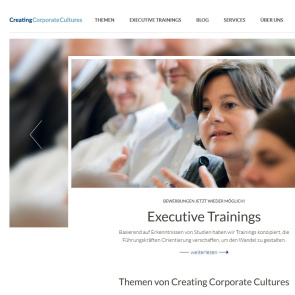 Mit der neuen Seite versteht sich das Team von Creating Corporate Cultures aus dem Kompetenzzentrum Führung und Unternehmenskultur als Impulsgeber und Trendsetter für Führungskräfte und Organisationen. Diskutieren Sie mit uns als eine/r der ersten im brandneuen Blog, buchen Sie eines unserer Executive Trainings oder informieren Sie sich über aktuelle Publikationen und Angebote.