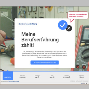 Seit Ende April können mit dem kostenfreien Selbsteinschätzungstool berufliche Vorerfahrungen in 29 von 30 Berufen erfasst werden. Das Spektrum reicht von A wie Altenpflegerhelfer/in über K wie Kfz-Mechatroniker/in bis V wie Verkäufer/in. Ein Selbstcheck dauert nur 5 Minuten und ist in 6 Sprachen möglich: Deutsch, Englisch, Arabisch, Farsi, Russisch und Türkisch. weiterlesen