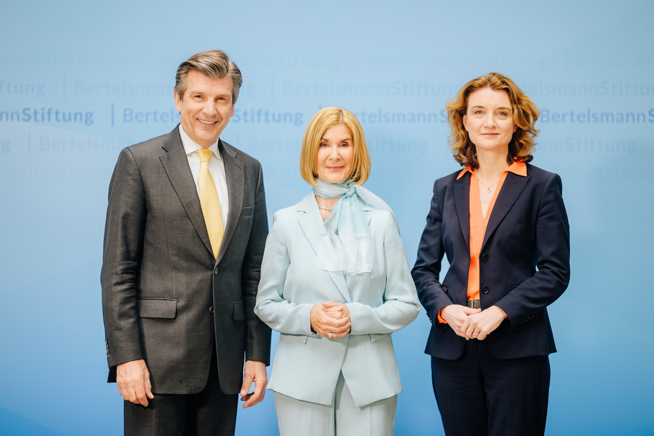 Foto von der Jahrespressekonferenz 2024 Bild herunterladen Von links: Ralph Heck, Vorstandsvorsitzender der Bertelsmann Stiftung; Brigitte Mohn, Vorständin der Bertelsmann Stiftung; Daniela Schwarzer, Vorständin der Bertelsmann Stiftung. Foto: Besim Mazhiqi