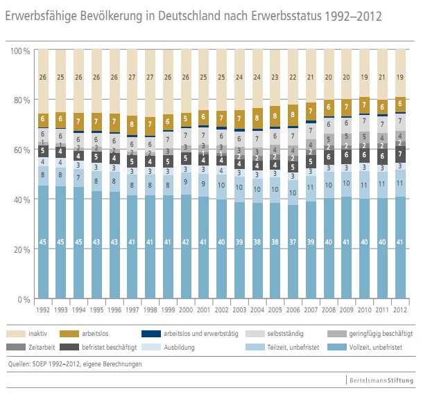 Die Autoren sprechen angesichts der Umwälzungen auf dem Arbeitsmarkt mit zunehmenden Anforderungen an die Flexibilität der Arbeitnehmer von einer "erstaunlichen Stabilität der so genannten Normalarbeitsverhältnisse", die sowohl im industriellen Sektor als auch in vielen Dienstleistungsberufen feststellbar sei. Hingegen gibt es einen direkten Zusammenhang zwischen der Zunahme an atypischer Beschäftigung und der Abnahme der strukturellen Arbeitslosigkeit. Denn während seit 2003 der Anteil der atypischen Jobs von 19 auf 24 Prozent kletterte, ging der Anteil der auf dem Arbeitsmarkt Inaktiven von 24 auf 19 Prozent zurück.
