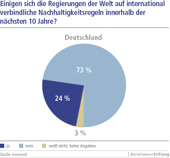 87 Prozent der Befragten plädieren für verschärfte nationale Regelungen im Umweltschutz, 84 Prozent befürworten die Einleitung einer Energiewende in Deutschland, und 82 Prozent möchten die deutsche Bankenaufsicht verschärft wissen. Grundsätzlich begrüßten aber 91 Prozent, wenn diese Maßnahmen langfristig mittels verbindlicher internationaler Regelungen erreicht werden könnten. 73 Prozent der Deutschen glauben allerdings nicht, dass es den Regierungen der Welt gelingt, sich innerhalb der nächsten zehn Jahre gemeinsam darüber zu einigen, wie die Finanzmärkte im Zaum gehalten, die ungehemmte Nutzung natürlicher Ressourcen einschränkt und der weitere Anstieg von CO2-Emissionen gestoppt werden können. Unter den gegenwärtigen Bedingungen halten 71 Prozent sogar eine weitere Wirtschafts- und Finanzkrise jederzeit für möglich.