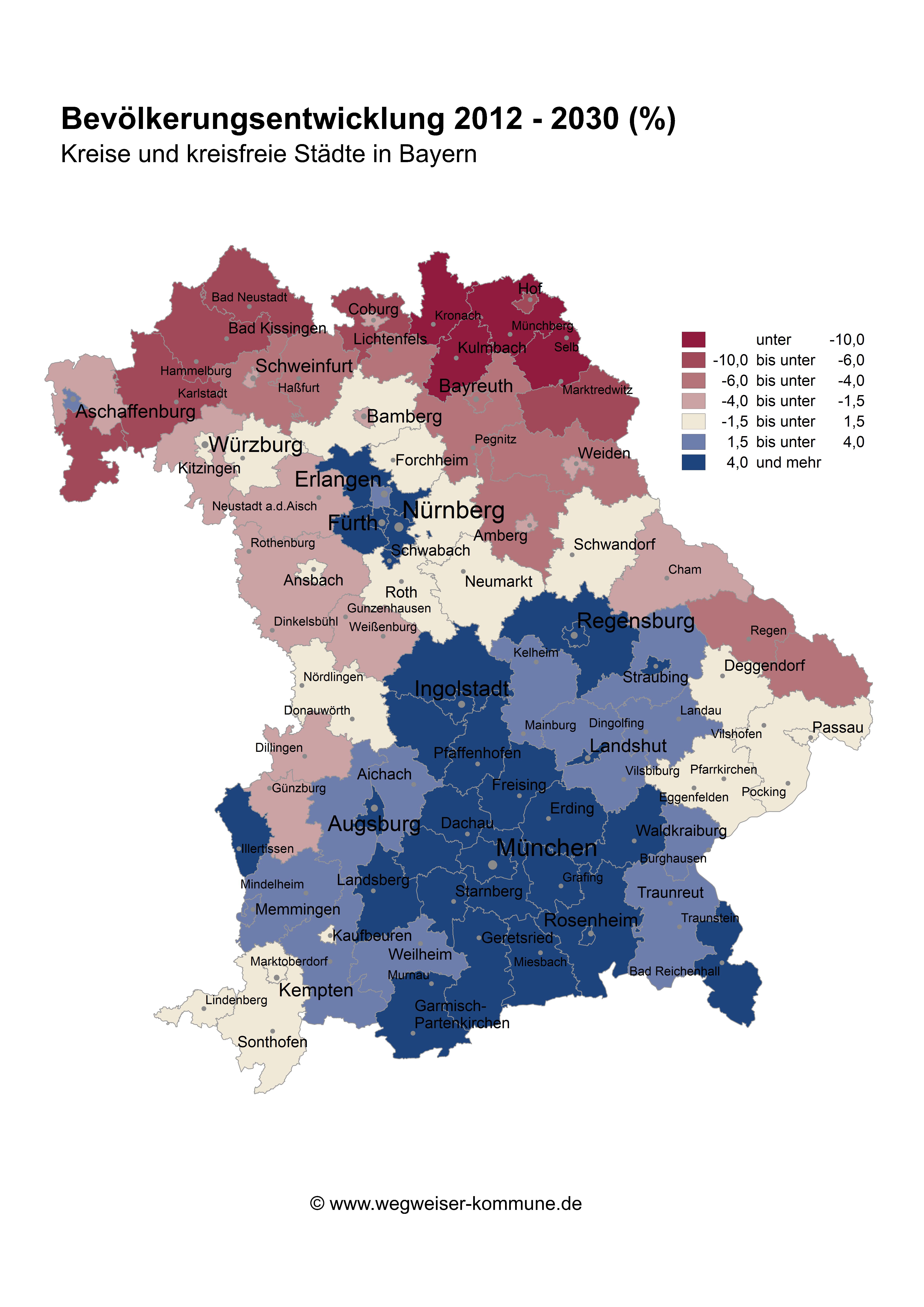 Vor allem für viele Gemeinden im ländlichen Raum dürften die Folgen des Bevölkerungsrückgangs dramatisch werden. In Hoyerswerda (Kreis Bautzen), Bitterfeld-Wolfen (Kreis Anhalt-Bitterfeld), Gräfenhainichen (Kreis Wittenberg) oder Roßleben (Kyffhäuserkreis) wohnen 2030 gut 26 Prozent weniger Menschen als 2012. Unterföhring, Feldkirchen (beide Kreis München), Ilvesheim (Rhein-Neckar-Kreis) und Teltow (Kreis Potsdam-Mittelmark) hingegen erwarten einen Anstieg der Einwohnerzahl um mehr als ein Viertel. Generell setzt sich der Trend fort: Städtische Regionen wachsen, der ländliche Raum verliert. Brigitte Mohn, Vorstand der Bertelsmann Stiftung: "Es wird für die schrumpfenden und alternden Regionen immer schwieriger, eine gute Infrastruktur zu gewährleisten." Die zentrale Herausforderung sei, auch in einwohnerschwachen Regionen flexible Mobilitätsangebote, schnelles Internet und eine angemessene Gesundheitsversorgung in erreichbarer Nähe anzubieten.