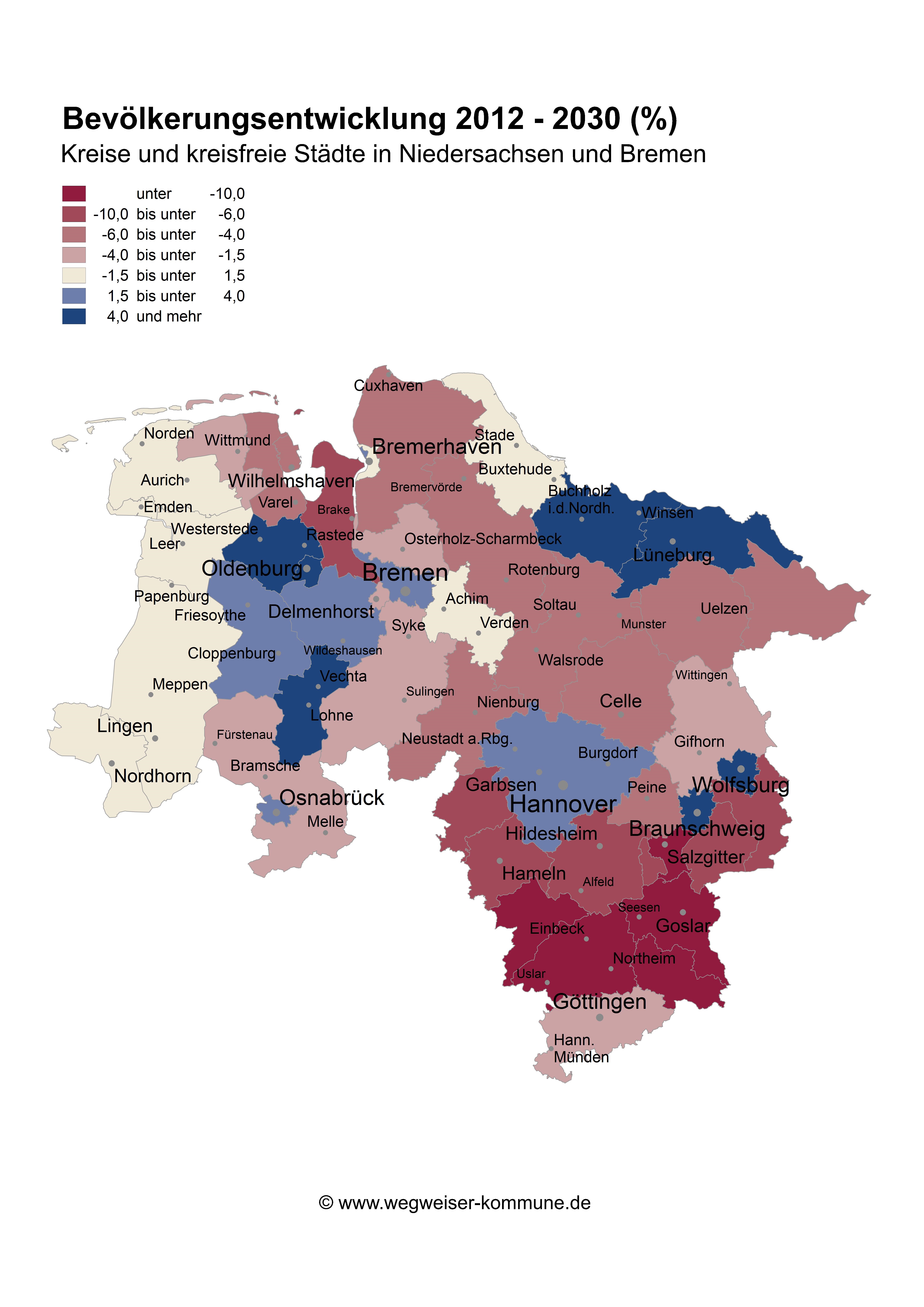- Landkarte: Bevölkerungsprognose Niedersachsen und Bremen