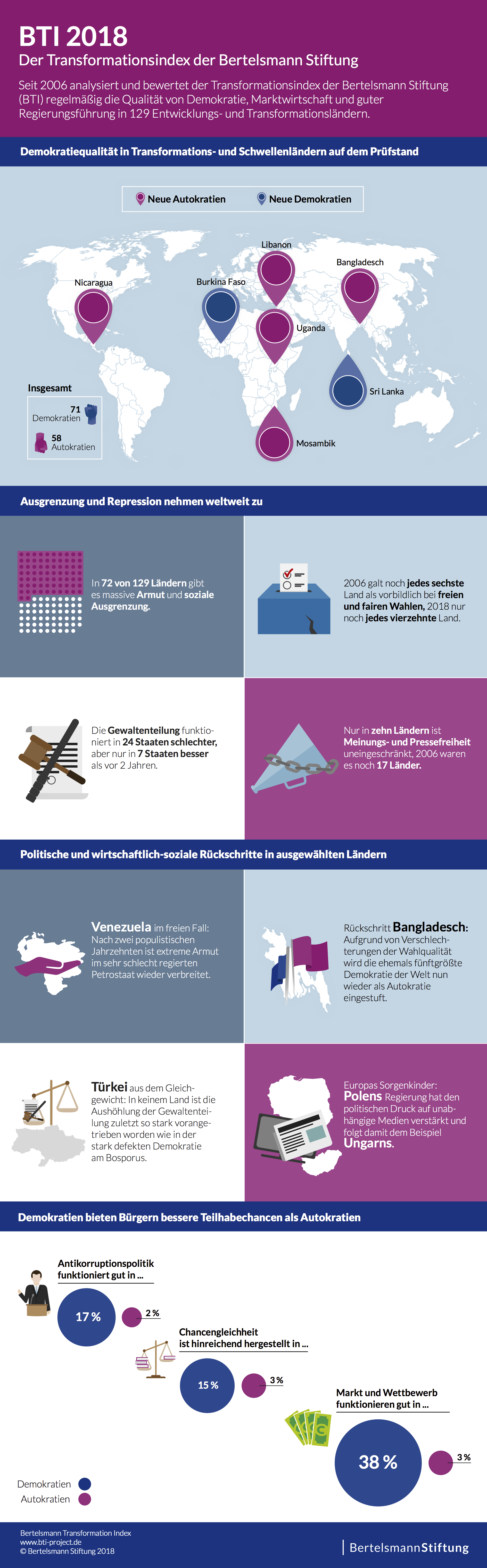 Weltweit leben immer mehr Menschen nicht nur in ungleichen, sondern auch in repressiven Regimen: Aktuell werden 3,3 Milliarden Menschen autokratisch regiert, so viele wie noch nie seit Start der Untersuchung. Ihnen stehen 4,2 Milliarden Menschen gegenüber, die in Demokratien leben. Von den 129 untersuchten Ländern stuft der BTI 58 als Autokratien und 71 als Demokratien ein. 2016 betrug das Verhältnis noch 55 zu 74. Aber es ist weniger die leicht steigende Zahl von Autokratien, die bedenklich stimmt. Problematisch ist, dass in im-mer mehr Demokratien Bürgerrechte beschnitten und rechtsstaatliche Standards ausgehöhlt werden. Ehemalige Leuchttürme der Demokratisierung wie Brasilien, Polen oder die Türkei gehören zu den größten Verlierern im BTI.