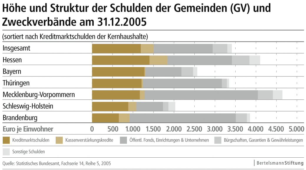 Insgesamt weisen die Städte und Gemeinden in den 16 Bundesländern ein unterschiedliches Verschuldensniveau aus. Die niedrigste Pro-Kopf-Verschuldung verzeichnet der "Kommunale Schuldenreport" der Bertelsmann Stiftung für Schleswig-Holstein (2.031 Euro), gefolgt von Bayern (2.566), Niedersachsen (2.802) und Baden-Württemberg (2.855). Im Mittelfeld liegen Thüringen (3.344), Rheinland-Pfalz (3.529), Brandenburg (3.856) und Sachsen (3.972). Die Schlussgruppe bilden Nordrhein-Westfalen (4.083), Hessen (4.102), Sachsen-Anhalt (4.193) und das Saarland (4.265). Mecklenburg-Vorpommern hält mit einer Pro-Kopf-Verschuldung der kommunalen Haushalte von 4.645 Euro die rote Laterne.