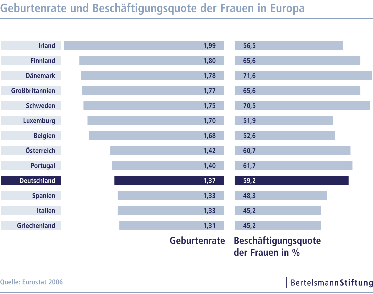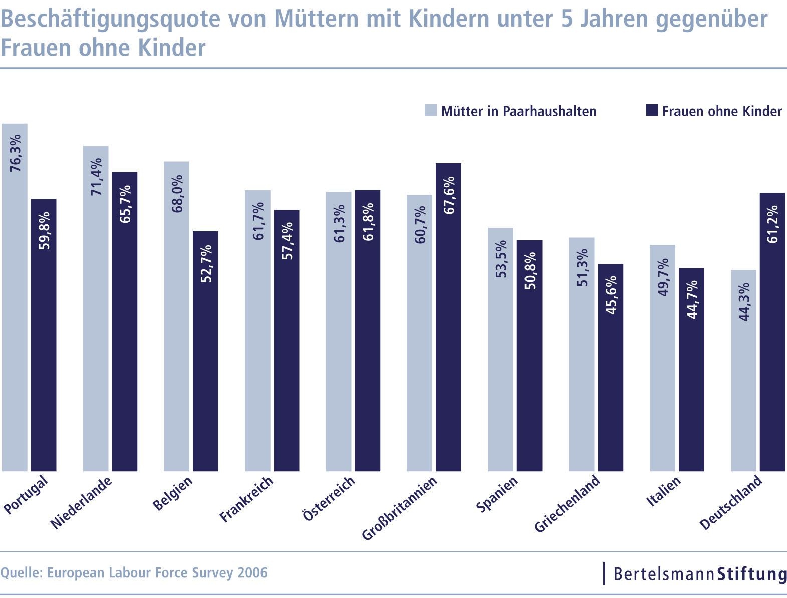 Neben Deutschland fällt es insbesondere den südeuropäischen Staaten mit einem traditionellen Rollenverständnis schwer, die Konflikte zwischen Berufstätigkeit und Elternschaft zu lösen, stellen die Autoren auf der Basis von Eurostat- und OECD-Daten fest. Zusammen mit Spanien, Griechenland und Italien bildet Deutschland das Schlusslicht sowohl bei der Geburtenrate als auch beim Beschäftigtenanteil von Müttern mit Kindern unter fünf Jahren. Während in Portugal, den Niederlanden, Belgien, Frankreich und Österreich sowie Großbritannien über 60 Prozent der Mütter mit kleinen Kindern beschäftigt sind, sind es in Deutschland lediglich 44,3 Prozent und nur 37,1 Prozent der allein erziehenden Mütter. Hinzu kommt, dass im Anschluss an eine familienbedingte Auszeit oft nur eine Teilzeittätigkeit mit geringer Stundenzahl ausgeübt wird, obwohl die Erwerbswünsche deutlich umfangreicher ausfallen. Die traditionell starke Trennung zwischen Familienverantwortung und Berufstätigkeit zeigt sich auch daran, dass Deutschland mit 44,3 Prozent den höchsten Anteil an Alleinverdienerhaushalten hinter Griechenland aufweist.