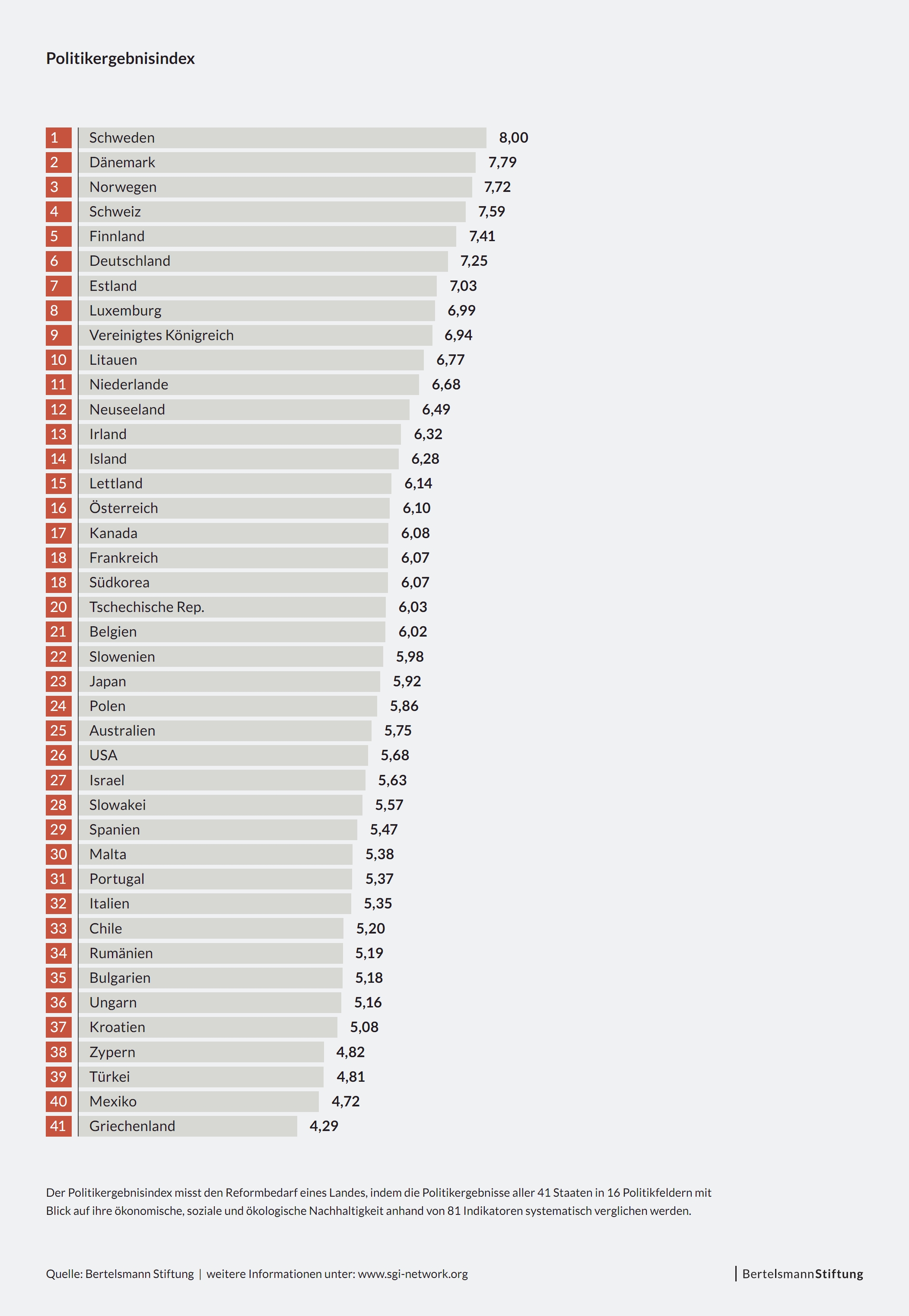 - Der Politikergebnis-Index misst den Reformbedarf eines Landes, indem die Politikergebnisse aller 41 Staaten mit Blick auf ihre ökonomische, soziale und ökologische Nachhaltigkeit systematisch verglichen werden.