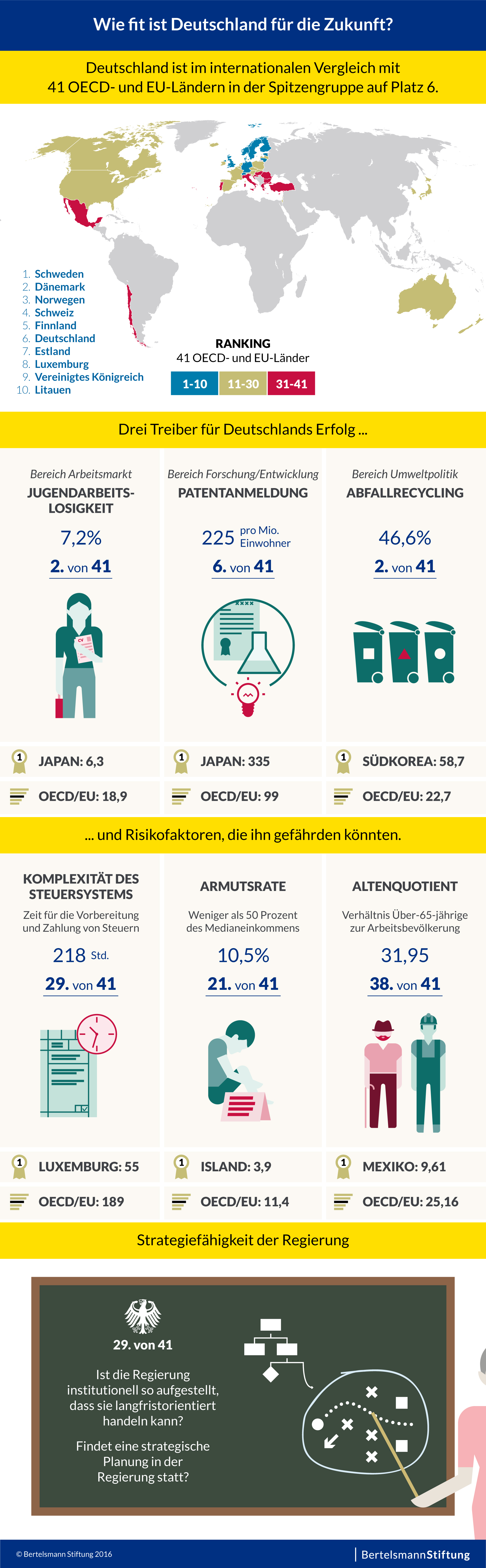 Während Deutschland noch zu Beginn des Jahrtausends als kranker Mann Europas galt, hat es sich mittlerweile den Ruf eines Musterschülers erarbeitet und lässt vergleichbare Industriestaaten hinter sich. Zum Vergleich: Die USA als größte Volkswirtschaft der Welt rangieren auf Platz 26. Auch andere G7-Staaten wie Großbritannien (9. Platz), Frankreich (18. Platz) oder Japan (23. Platz) hat Deutschland klar überholt. Schlusslicht bleibt unverändert Griechenland. "Deutschland genießt mittlerweile eine Vorbildfunktion, vor allem dank eines starken Arbeitsmarktes. An aktuellen Problemfeldern wie der Rente und dem wachsenden Armutsrisiko wird sich zeigen, ob Deutschland auch zukünftig als Vorbild gelten kann", sagt Aart De Geus, Vorstandsvorsitzender der Bertelsmann Stiftung.