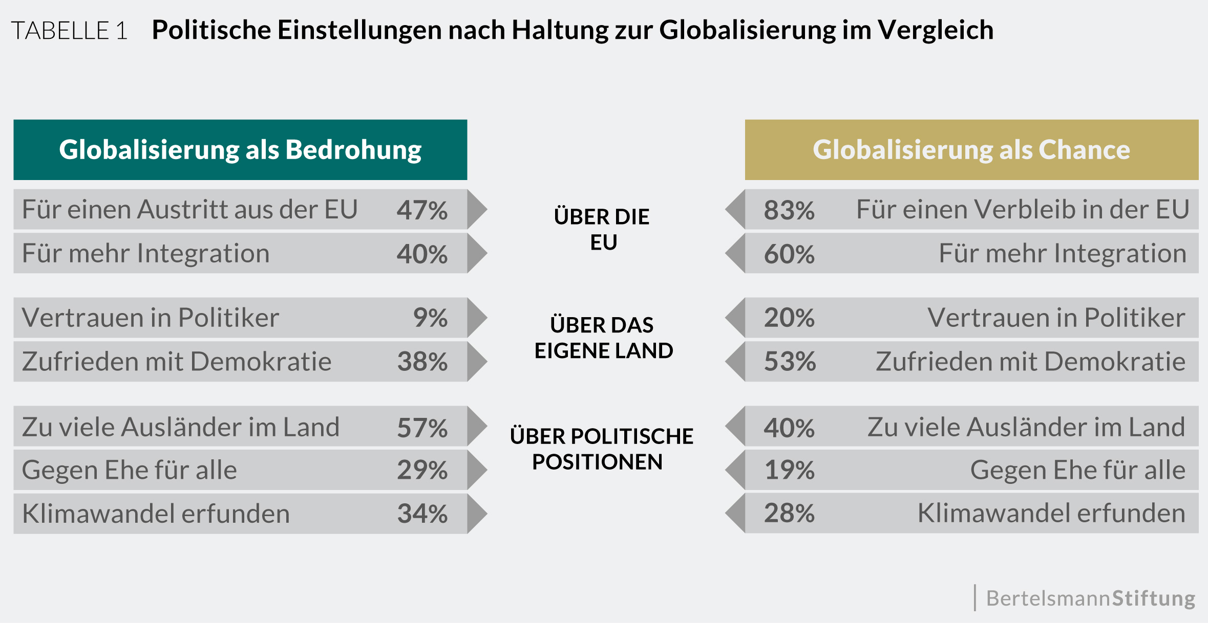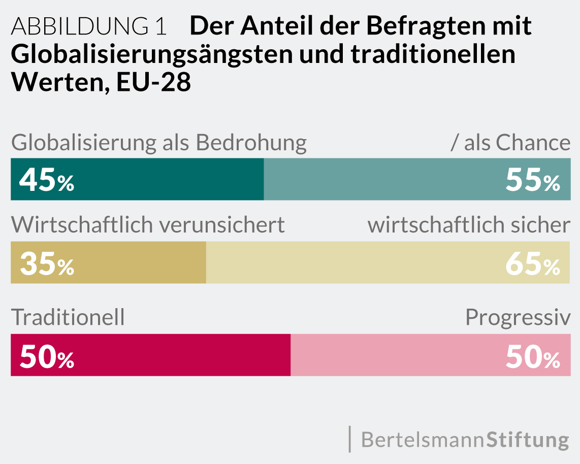 Die Umfrage hat untersucht, was die politischen Einstellungen der Europäer stärker beeinflusst: der persönliche Wertekompass (liberal-autoritär) oder die Angst vor Globalisierung und ökonomischem Abstieg. Ob die Befragten ein liberales oder konservativ-autoritäres Weltbild haben, spielt bei Aussagen zur Politik zwar eine Rolle; jedoch sind die Unterschiede über Länder und Parteipräferenzen hinweg meist gering oder nicht einheitlich verteilt. Die Bewertung der Globalisierung hingegen ist ein deutlich aussagekräftigeres Kriterium. Durch die entsprechende Einordnung der Europäer in Globalisierungspessimisten (Angst vor Globalisierung) und -optimisten (Globalisierung als Chance) lassen sich ihre Einstellungen ge-genüber Politik und Gesellschaft in der EU vergleichsweise gut erklären.