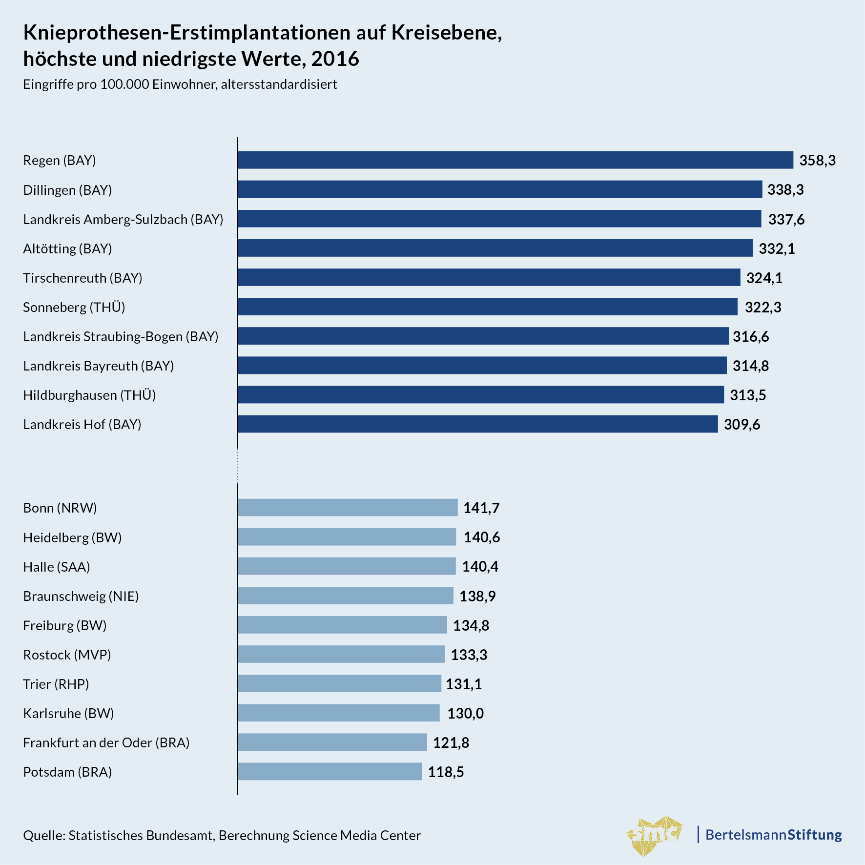 - Grafik: Knieprothesen-Erstimplantationen auf Kreisebene 2016, höchste und niedrigste Werte