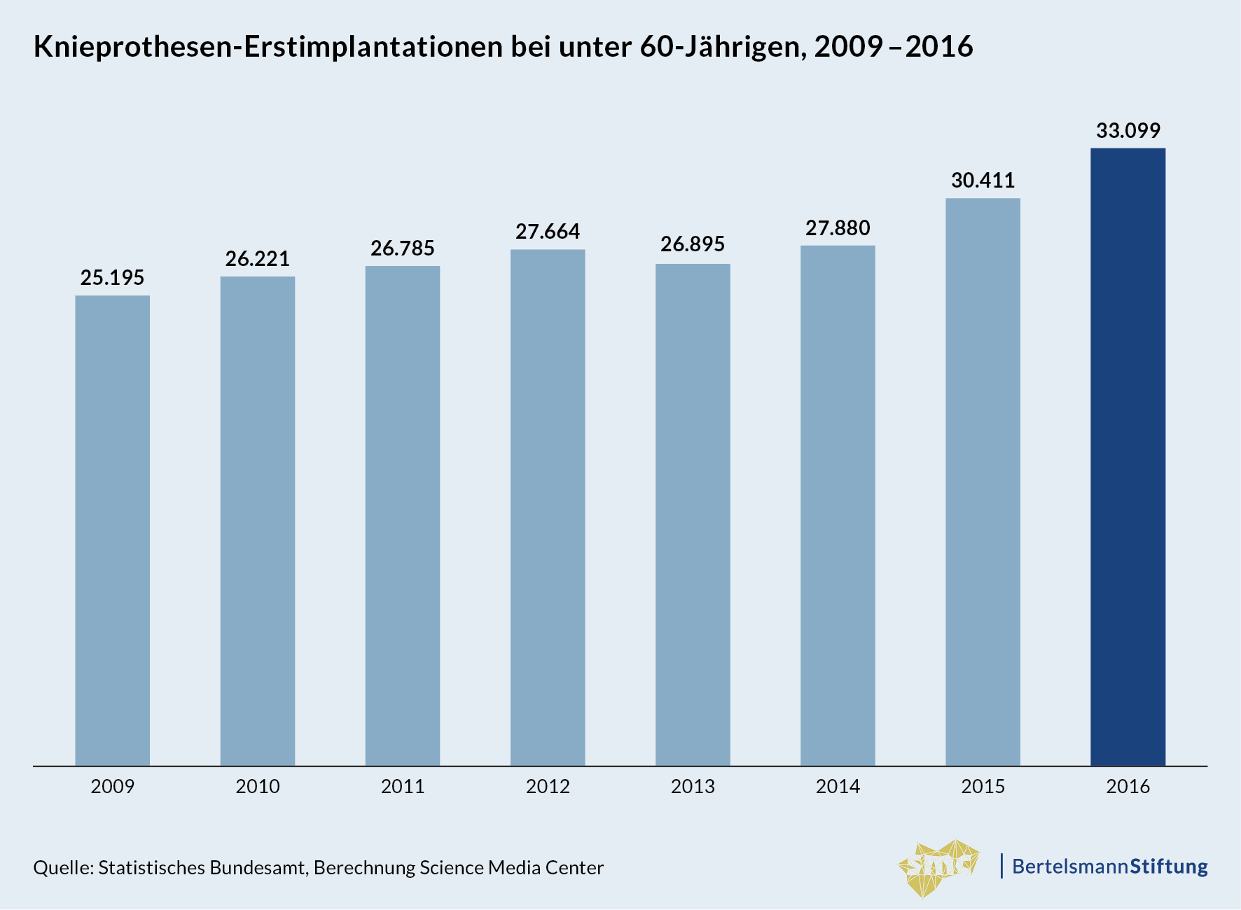 - Grafik: Zahl der Knieprothesen-Erstimplantationen bei unter 60-Jährigen 2009-2016