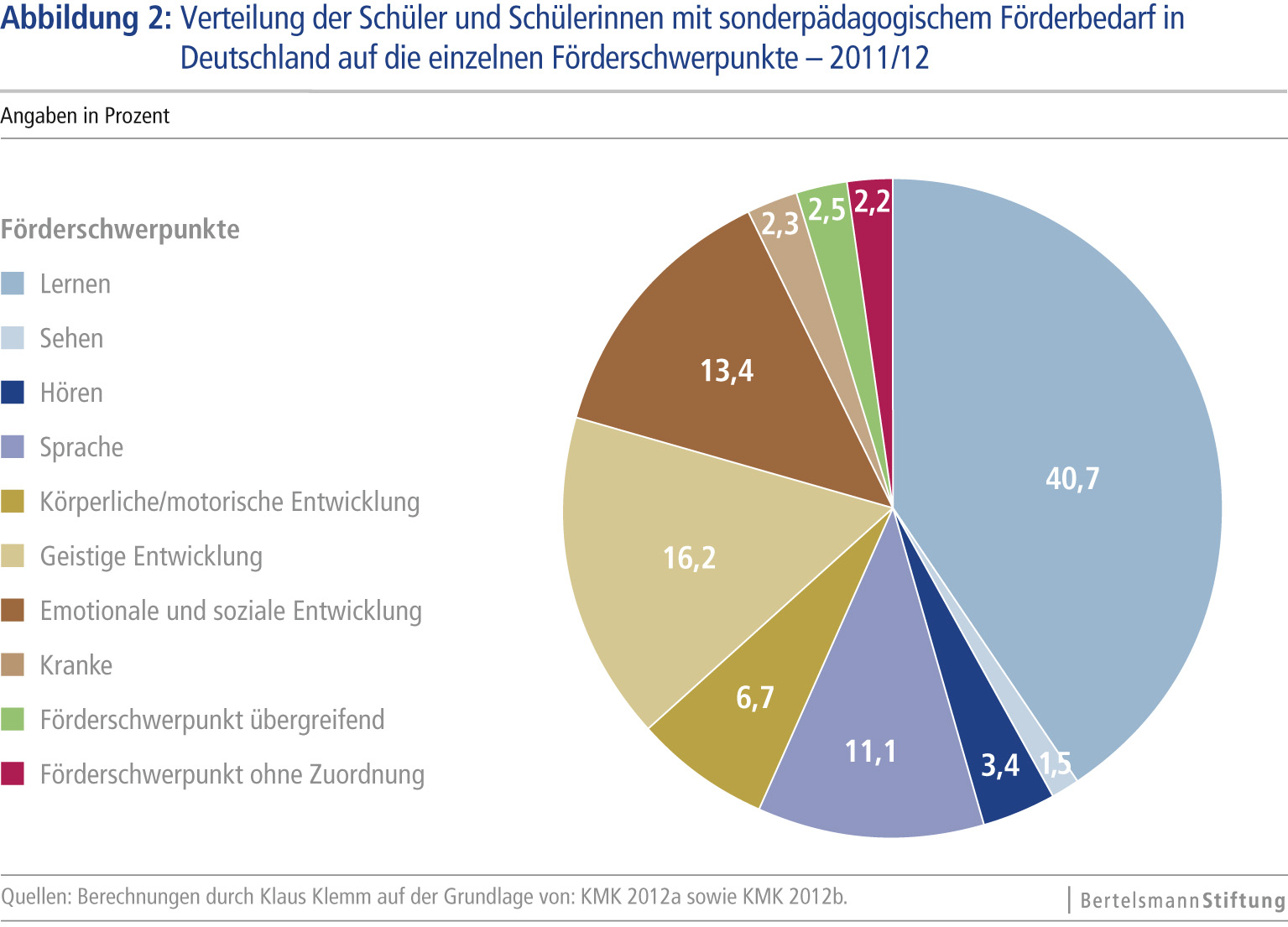 "Inklusion nimmt in Deutschland an Fahrt auf. Kinder mit Handicaps müssen nicht länger automatisch auf eine getrennte Förderschule gehen", sagte Jörg Dräger, Vorstand der Bertelsmann Stiftung, mit Verweis auf den deutlich gestiegenen Inklusionsanteil. Zugleich steige jedoch die Zahl der Förderschüler: Im März 2009, als die UN-Konvention zur Abkehr vom derzeitigen Sonderschulsystem in Kraft trat, lag der Anteil der Kinder und Jugendlichen mit Handicaps an der gesamten Schülerschaft noch bei sechs Prozent. Im Schuljahr 2011/12 betrug er 6,4 Prozent. Insgesamt haben damit rund eine halbe Million Schüler in Deutschland besonderen Förderbedarf. Damit ist der Anteil der Kinder und Jugendlichen, die nicht auf eine reguläre Schule gehen, seit 2009 von 4,9 auf 4,8 Prozent nur minimal gesunken. Das belege, so Dräger, dass das Doppelsystem aus Regelschulen einerseits und separaten Förderschulen andererseits unverändert Bestand habe.