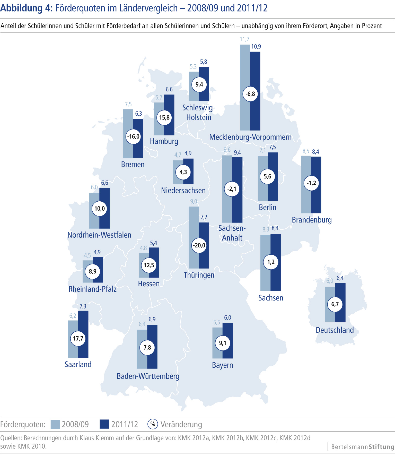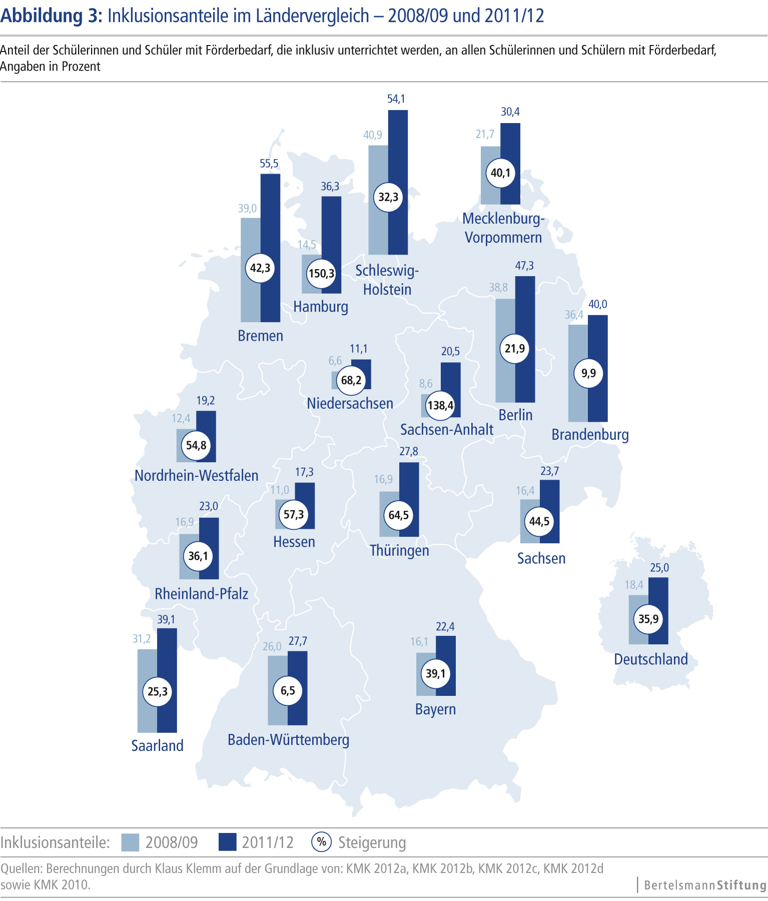 In Bremen (55,5 Prozent) und Schleswig-Holstein (54,1 Prozent) etwa besuchen mehr als die Hälfte aller Förderschüler eine reguläre Schule. In Niedersachsen (11,1 Prozent) hingegen wird lediglich jeder neunte Förderschüler inklusiv unterrichtet. Die größte Steigerung des Inklusionsanteils seit 2009 verzeichnet Hamburg: Dort hat sich der Anteil der Förderkinder, die eine reguläre Schule besuchen, weit mehr als verdoppelt (von 14,5 auf 36,3 Prozent). Ähnliches gilt für Sachsen-Anhalt (von 8,6 auf 20,5 Prozent).