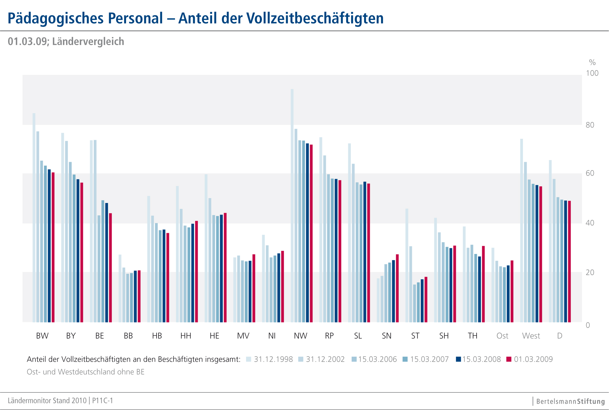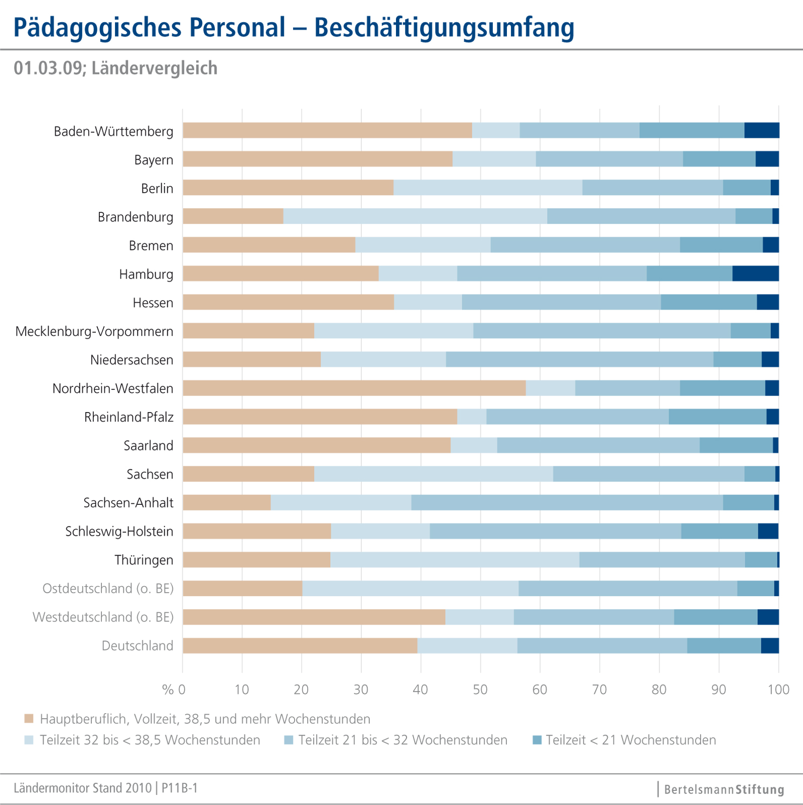 Weitere Analysen des Ländermonitors Frühkindliche Bildungssysteme 2010 zeigen, dass zunehmend mehr Kita-Beschäftigte in Teilzeit tätig sind. Waren vor zehn Jahren noch über die Hälfte von ihnen in Vollzeit beschäftigt, liegt dieser Anteil nun unter 40 Prozent. Im Osten arbeiten hingegen 80 Prozent der Beschäftigten weniger als 38 Stunden pro Woche, im Westen sind es 56 Prozent. Für die Beschäftigten bedeutet das geringere Einkommen, zudem macht es diese Entwicklung schwieriger, die nötigen stabilen und kontinuierlichen Beziehungsstrukturen zu schaffen. Dies ist insbesondere für den steigenden Anteil von Kindern bedeutsam, die ganztags betreut werden.