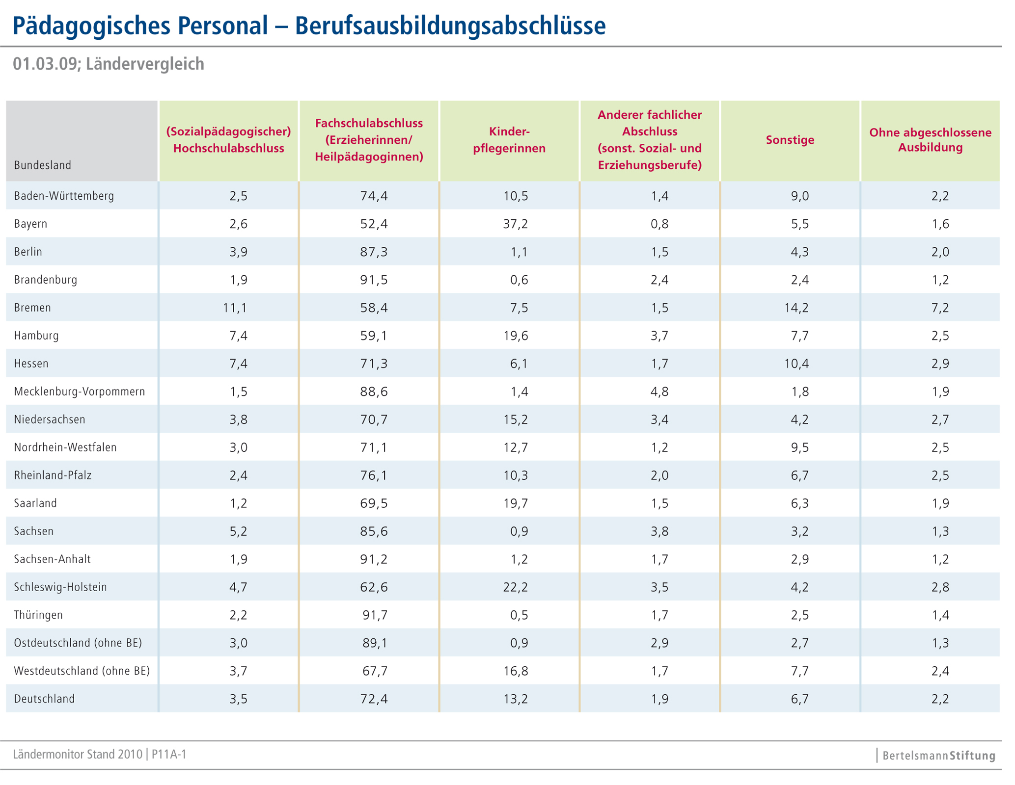 Seit 2007 hat sich das Ausbildungsniveau der pädagogischen Fachkräfte in Deutschland laut Ländermonitor kaum verändert. Insgesamt haben rund 72 Prozent einen Fachschulabschluss als Erzieherin, mehr als 13 Prozent einen Berufsschulabschluss als Kinderpflegerin und nur 3,5 Prozent verfügen über einen Hochschulabschluss. Die zahlreichen neu eingerichteten Studiengänge an Hochschulen haben zwischen 2007 und 2009 noch keinen deutlichen Anstieg bei der Zahl der Hochschulabsolventinnen unter den Erzieherinnen bewirkt.