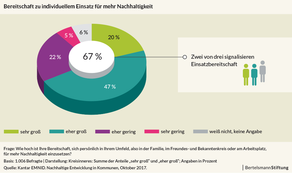 Die Verantwortlichen aus Kommunalpolitik und -verwaltung könnten auf die große Bereitschaft der Bürger zählen, sich für mehr Nachhaltigkeit zu engagieren. Besonders groß ist die Einsatzbereitschaft bei den Befragten mit mittleren und höheren Bildungsabschlüssen (70 Prozent), aber auch in bildungsferneren Schichten sind noch mehr als die Hälfte der Menschen bereit, sich persönlich einzubringen (52 Prozent).