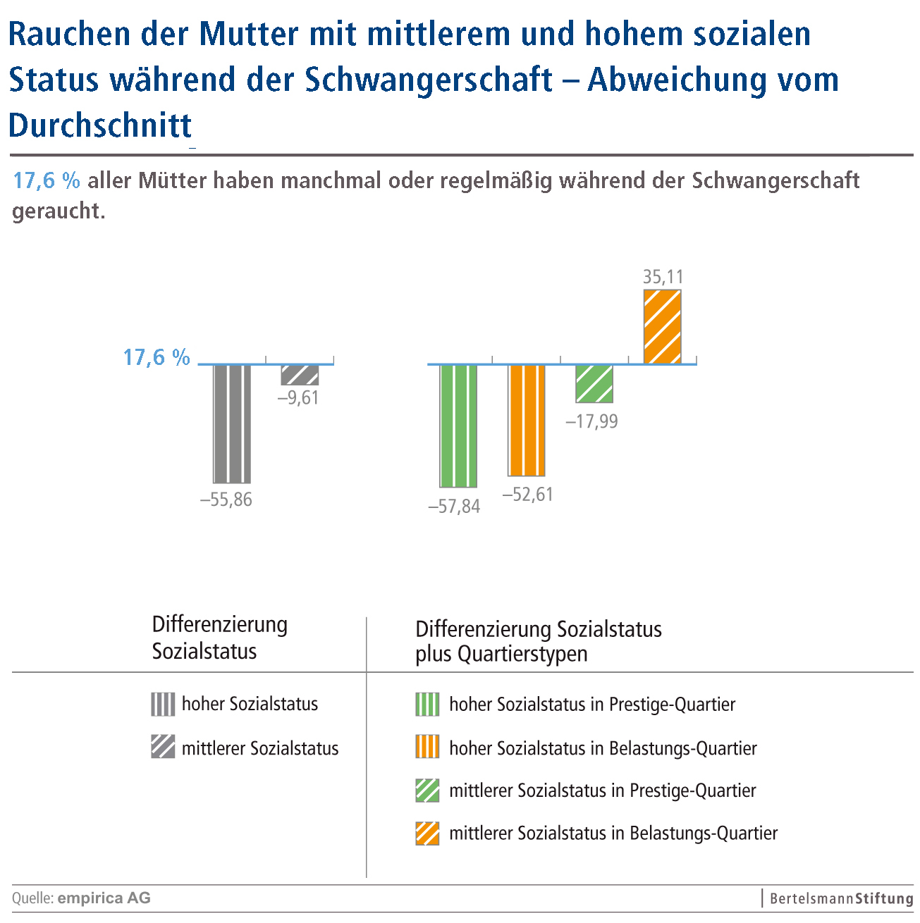Die Studie belegt eindeutig, dass der Quartierseinfluss sogar die soziale Mittelschicht teilt. Es macht für das gesundheitliche Verhalten einen signifikanten Unterschied aus, ob Familien in der Stadt überwiegend in Einfamilienhäusern mit einem mittleren bis hohen lokalen Mietpreisniveau leben oder in städtischen Wohnnachbarschaften mit niedrigen Mieten und viel Geschosswohnungsbau. So greifen in den städtischen Problemvierteln schwangere Frauen öfter zur Zigarette und stillen ihr Kind seltener: Dies gilt insbesondere auch für Schwangere aus der sozialen Mittelschicht.