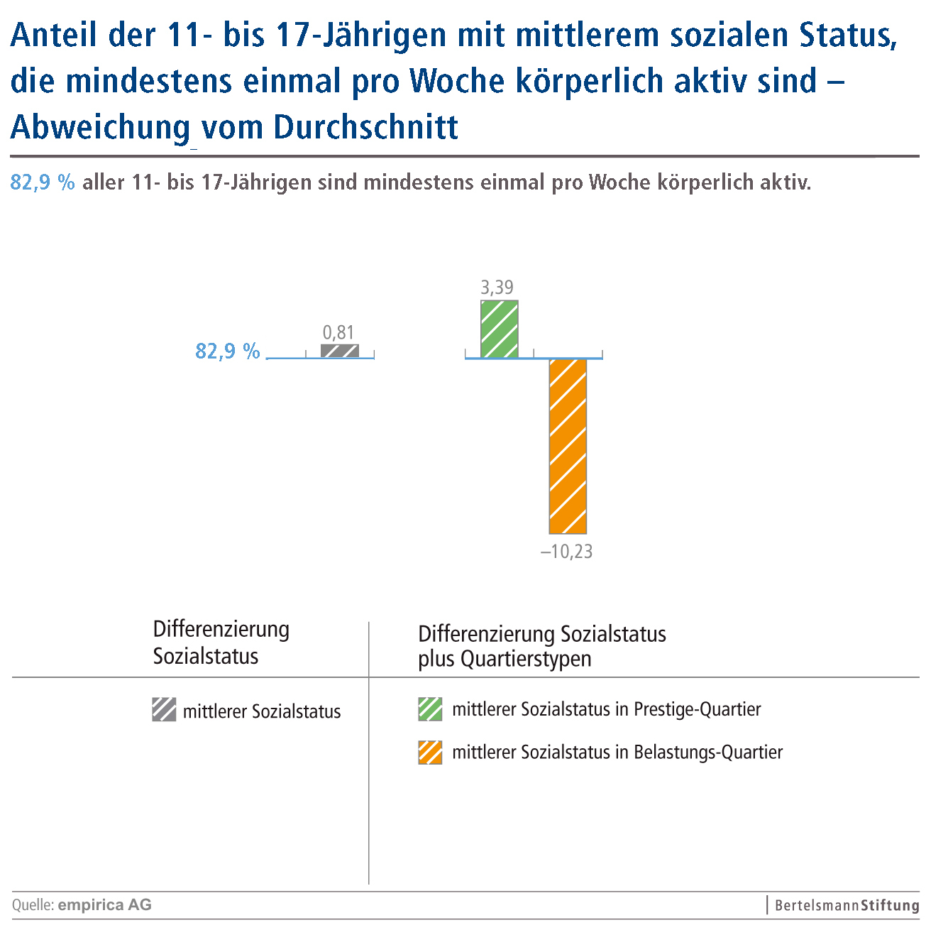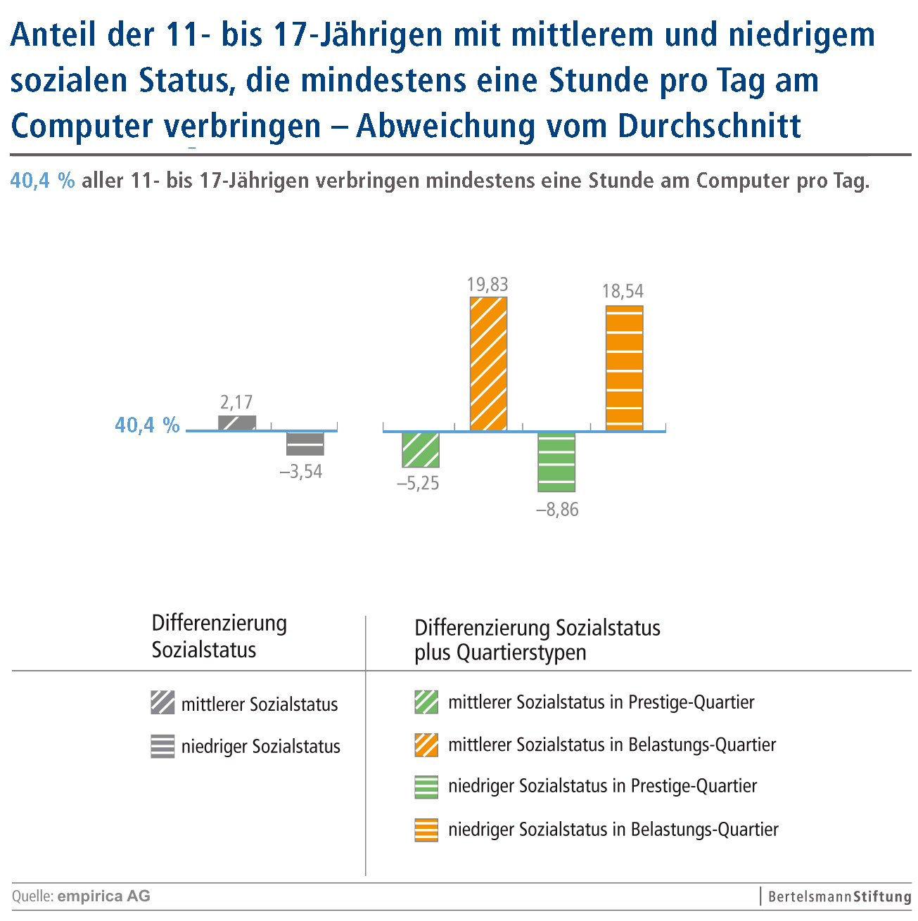 Zudem verbringen auch Kinder aus der sozialen Mittelschicht in preislich günstigen Wohngegenden überdurchschnittlich viel Zeit vor dem Fernsehapparat (6,6 Prozent mehr) und dem Computer (11,6 Prozent mehr) als in den teureren städtischen Wohngegenden. Umgekehrt kann ein attraktiver Lebensraum helfen, schwierige familiäre Verhältnisse zu stabilisieren und Kindern neue Perspektiven bieten. "Kinder aus Problemvierteln wachsen ungesünder auf und haben von vornherein weniger Möglichkeiten, sich zu entwickeln und ihre Talente zu entfalten – das dürfen wir als Gesellschaft nicht akzeptieren", so Dr. Jörg Dräger, für Bildung zuständiges Vorstandsmitglied der Bertelsmann Stiftung.