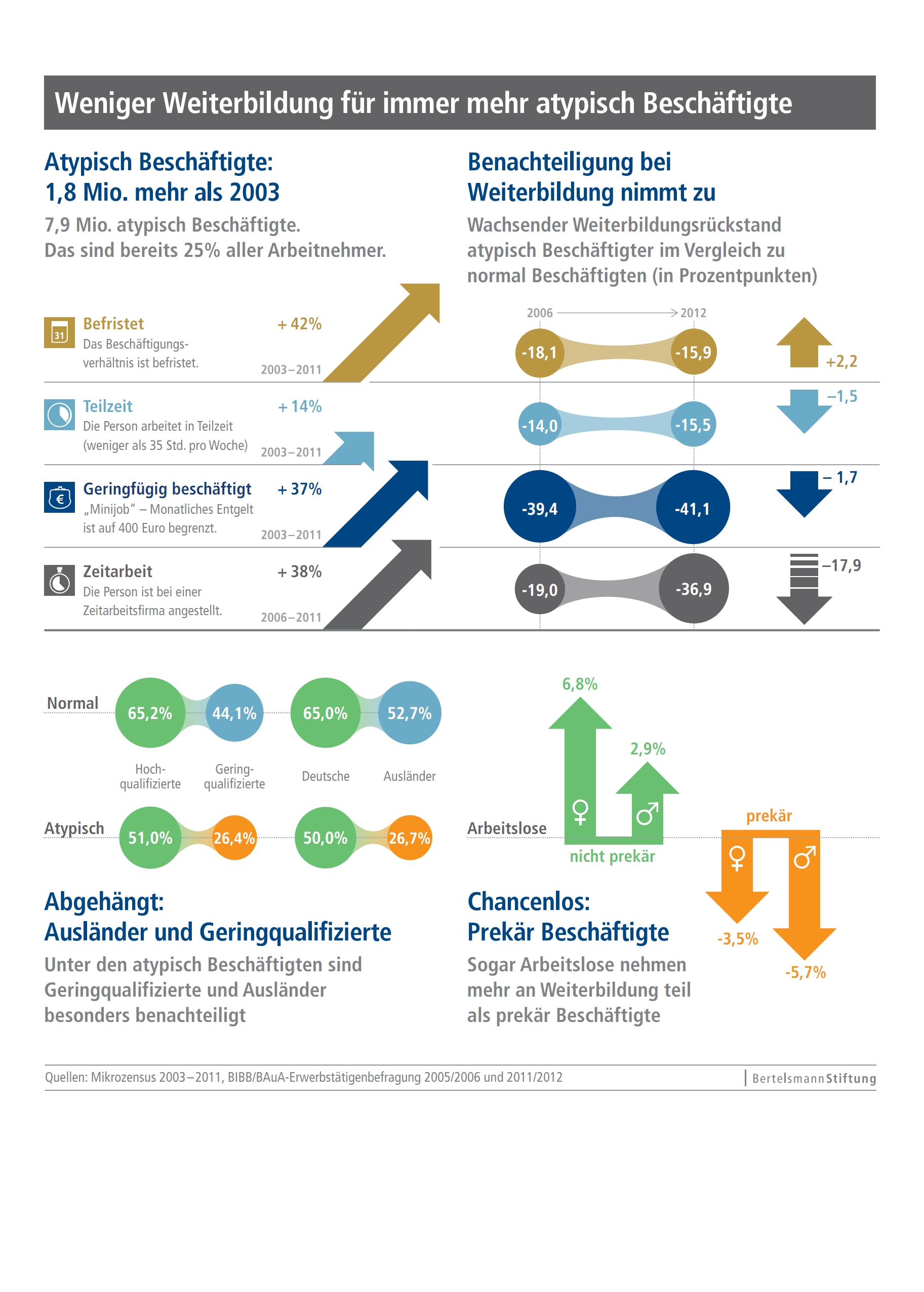 Unter den atypisch Beschäftigten haben die fünf Millionen Teilzeit- und die 2,8 Millionen befristet Beschäftigten die besten Aussichten auf berufliche Weiterbildung mit jeweils über 48 Prozent. Vor allem bei den befristeten Arbeitsverhältnissen stieg die Beteiligung an Weiterbildung; 2006 hatte sie noch bei 44 Prozent gelegen. Weniger Chancen auf Weiterbildung als die 775.000 Zeitarbeiter (27 Prozent) haben mit 23 Prozent nur noch die 2,7 Millionen geringfügig Beschäftigten ("Mini-Jobber").