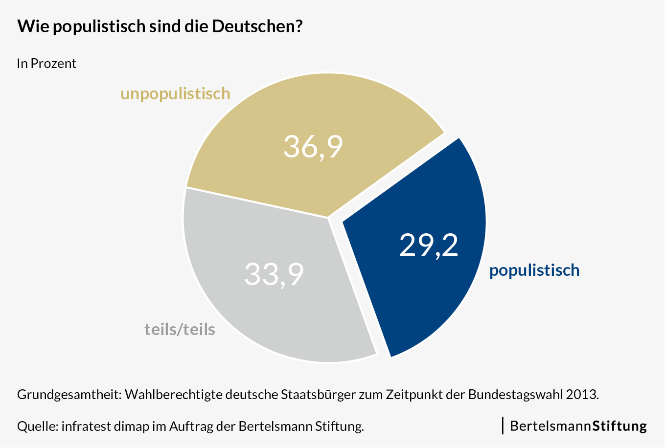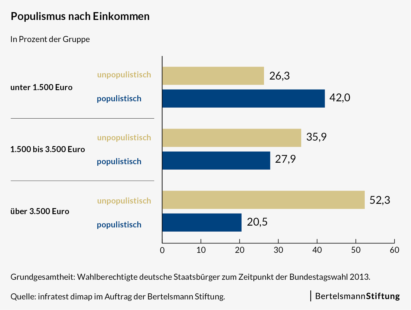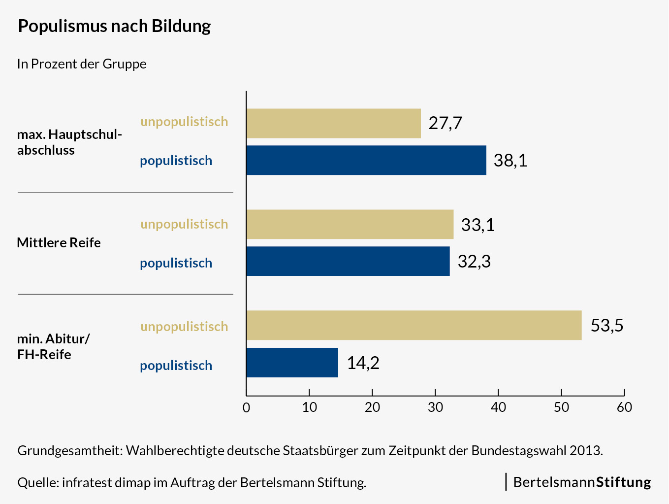 Populistisch eingestellte Wähler gibt es zwar über alle Parteigrenzen hinweg. Es zeigt sich jedoch eine soziale Spaltung: Je geringer der formale Bildungsstand und je niedriger das Einkommen, desto weiter verbreitet sind populistische Einstellungen. Bei Personen, die maximal über einen Hauptschulabschluss und ein durchschnittliches Monatseinkommen unterhalb von 1.500 Euro verfügen, sind populistische Einstellungen am stärksten ausgeprägt. Aufgrund ihres sozialen Profils sind auch Nichtwähler häufiger populistisch eingestellt (36,4 Prozent) als Wähler (26,3 Prozent).