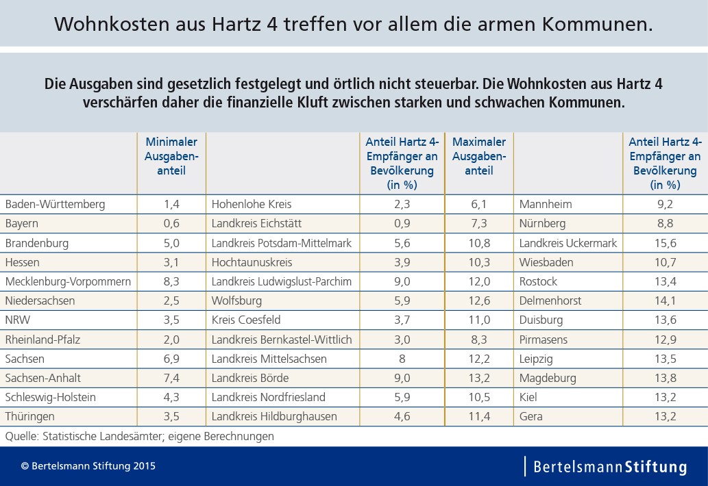 Vor allem wirtschaftsschwache Kommunen mit hoher Langzeitarbeitslosigkeit und geringen Steuereinnahmen ächzen unter den hohen Ausgaben für diese Wohnkosten. Sie beliefen sich 2013 bundesweit auf rund 14 Milliarden Euro. Im wirtschaftsstarken Baden-Württemberg binden sie lediglich 3 Prozent der kommunalen Etats, im strukturschwachen Sachsen-Anhalt hingegen 11 Prozent. Die Belastung der Stadt Magdeburg etwa ist fast zehn Mal höher als jene im baden-württembergischen Kreis Hohenlohe (13,2 zu 1,4 Prozent).