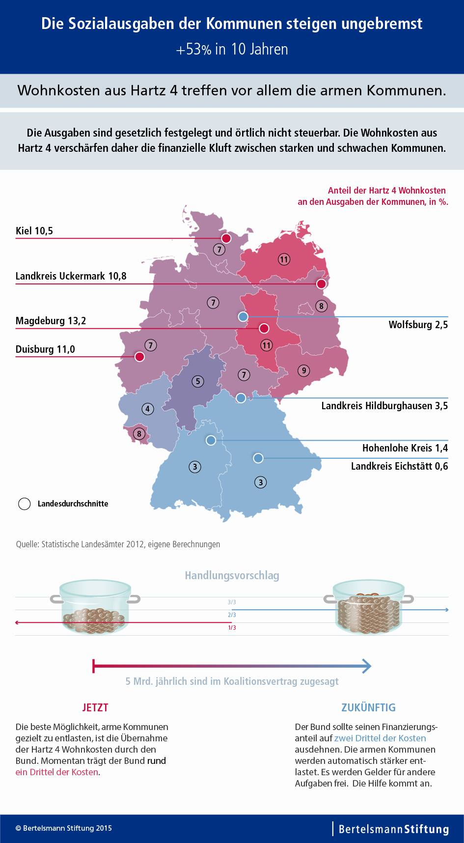 Die Bertelsmann Stiftung hat erstmals den gesamten Katalog kommunaler Sozialleistungen geprüft, um die Leistung zu finden, die am besten für eine Entlastung durch den Bund geeignet ist. Die Studie empfiehlt, mit den im Koalitionsvertrag zugesagten jährlich 5 Milliarden Euro die Wohnkosten für Hartz-4-Empfänger zu übernehmen. Diese Ausgaben ballen sich in armen Städten, ohne für diese steuerbar zu sein. Und sie sind durch den Bund über örtliche Mietspiegel leicht zu kontrollieren, was ein wichtiges Argument ist. Denn die finanziellen Entlastungen müssen einhergehen mit Kontrollrechten des Bundes. "Der Bund kann keinen Blanko-Scheck ausstellen. Die Wirtschaftlichkeit muss nachvollziehbar sein," sagte Geißler.