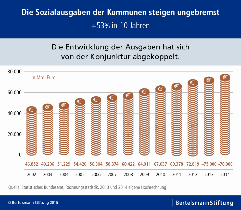 Gütersloh, 8. Juni 2015. Trotz guter Konjunktur sind in den vergangenen zehn Jahren die Sozialausgaben der Kommunen um mehr als 50 Prozent gestiegen. In 2014 summierten sie sich bundesweit auf rund 78 Milliarden Euro, berechnet eine Studie der Bertelsmann Stiftung. 2004 hatten sie noch bei 51 Milliarden Euro gelegen. Vielen Kommunen bleibt dadurch kaum noch Handlungsspielraum. In Flensburg etwa binden die Sozialleistungen inzwischen 58 Prozent des Etats.