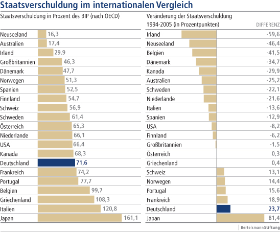 Besonders dringenden Handlungsbedarf sehen die Stiftungs-Experten auch beim Abbau der Staatsverschuldung. "Die Konsolidierung der öffentlichen Haushalte sowohl auf Bundes- als auch auf Länderebene ist oberstes Gebot", betonte Meffert. Die Verschuldungsquote des deutschen Staates beträgt - nach Berechnung der OECD - 71,6 Prozent des BIP und liegt damit um mehr als 20 Prozentpunkte höher als noch 1994. Allein in Japan ist der Schuldenberg stärker angestiegen. Dagegen hat es ein Großteil der betrachteten Nationen in den vergangenen Jahren geschafft, die Verbindlichkeiten der öffentlichen Hand zum Teil drastisch zu reduzieren. So konnten beispielsweise die Niederlande und Schweden die Staatsverschuldung seit 1994 um mehr als 20 Prozentpunkte, Belgien sogar um über 40 Prozentpunkte senken.