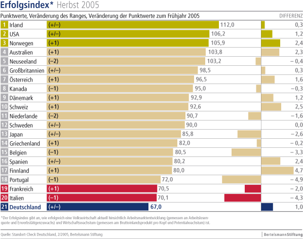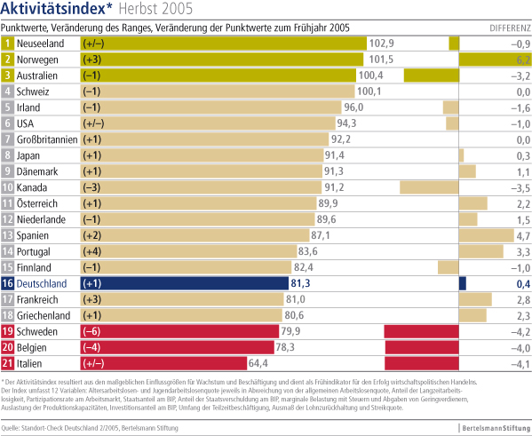 Die Bertelsmann Stiftung hatte im Herbst 2004 erstmals das Internationale Standort-Ranking veröffentlicht, das die Entwicklung der 21 wichtigsten Industrienationen in den Bereichen Wachstum und Beschäftigung vergleicht und bewertet. Der halbjährlich erscheinende "Standort-Check Deutschland" aktualisiert die Ergebnisse dieser Studie und prüft, ob die Bundesrepublik bei den wesentlichen Erfolgs- und Aktivitätsgrößen Fortschritte gemacht hat oder weiter zurückgefallen ist. Der Aktivitätsindex resultiert aus den maßgeblichen Einflussgrößen für Wachstum und Beschäftigung und dient als Frühindikator für den Erfolg wirtschaftspolitischen Handelns.