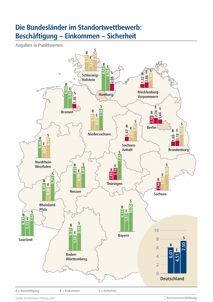Um die Standortqualität in den einzelnen Bundesländern messen und vergleichen zu können, er­arbeitete eine Expertengruppe unter der Leitung des Würzburger Wirtschaftswissenschaftlers Professor Norbert Berthold ein detailliertes Analyseinstrumentarium. Dabei wurden sowohl die Er­folge als auch die Aktivitäten der Bundesländer in den Dimensionen "Sicherheit", "Einkommen" und "Beschäftigung" untersucht.