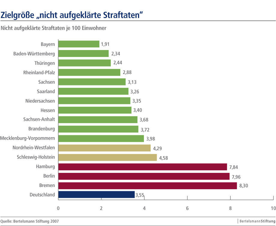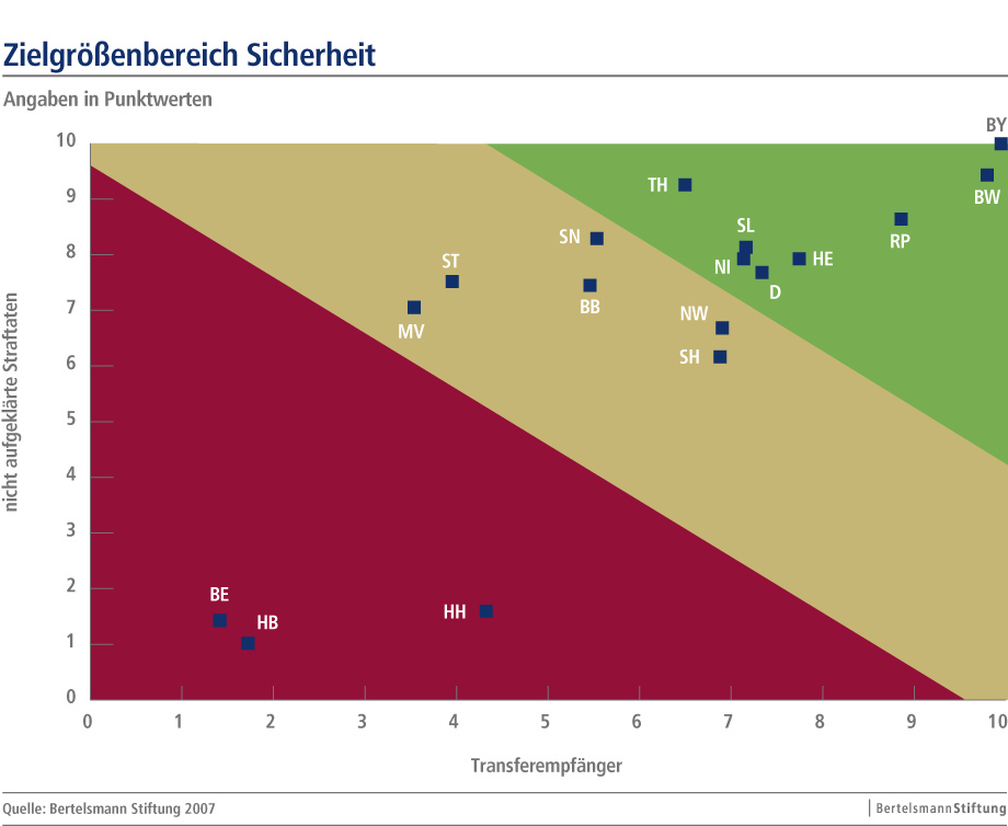 Im Bereich "Sicherheit" zeigt auch die weitere Reihenfolge, dass der Süden und Südosten Deutschlands in punkto Kriminalitäts- und Armutsbekämpfung deutlich erfolgreicher ist als die nördlichen Bundesländer. Im Ampelsystem der Bertelsmann Stiftung liegen neben Bayern und Baden-Württemberg auch Thüringen, Rheinland-Pfalz, Hessen und das Saarland im grünen Be­reich. Als einziges Nordlicht konnte sich Niedersachsen in die Spitzengruppe schieben. Im Mittel­feld liegen die Bundesländer Sachsen, Nordrhein-Westfalen, Schleswig-Holstein, Brandenburg, Sachsen-Anhalt und Mecklenburg-Vorpommern. Im roten Bereich befinden sich die Stadt-Staaten Hamburg, Berlin und Bremen.