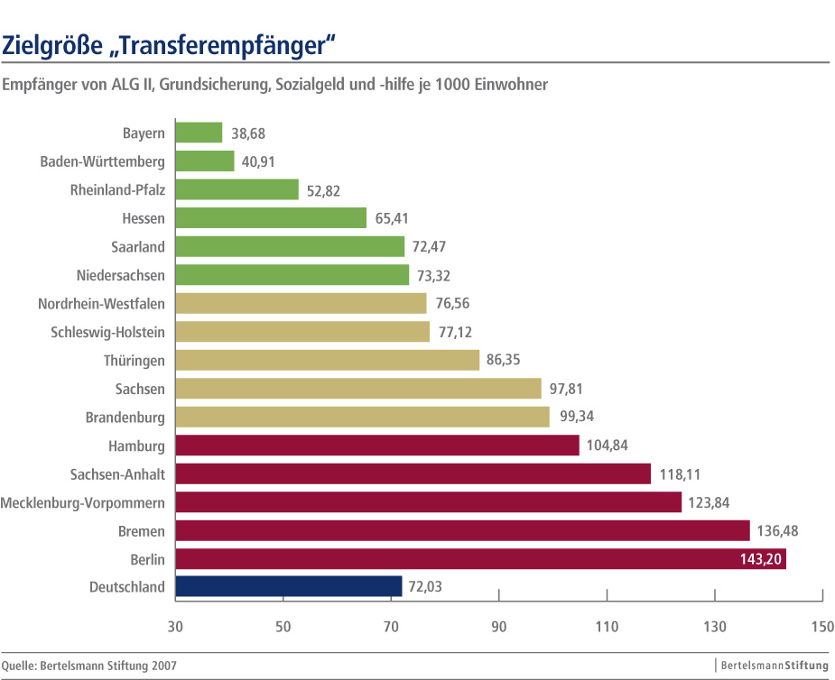 Besonders erfolgreich entwickelte sich im Bundesländer-Vergleich der Bertelsmann Stiftung das Saarland. Es liegt in allen betrachteten Dimensionen im grünen Bereich. Im Zeitraum zwischen 2004 und 2006 hat das Saarland mit rund 2,5 Prozent das stärkste Wirtschaftswachstum vorzu­weisen. Auch die Erfolge am Arbeitsmarkt können sich sehen lassen: Unter allen Bundesländern liegt es mit einer Erwerbstätigenquote von 72,4 Prozent auf dem sechsten Platz. "Trotz einer drü­ckenden Schuldenlast zeigt das einstige Sorgenkind, wie mit kluger Innovationspolitik und dem günstigen Rückenwind der Weltkonjunktur der Strukturwandel angegangen werden kann", sagte Meier.