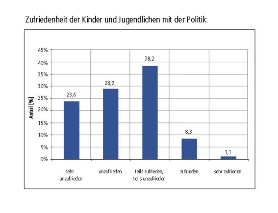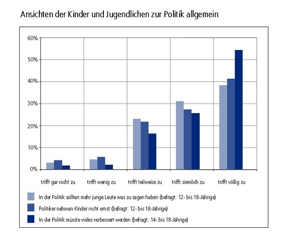 Lediglich 13,6 Prozent der jungen Menschen gaben an, sich bereits intensiv in der Kommune engagiert zu haben. Als Gründe für die mangelnde Mitwirkung wurden fehlende Informationen, mangelndes Interesse an kommunalpolitischen Themen und zu geringes Vertrauen in die Politiker genannt. Wenn sich Kinder und Jugendliche beteiligen, bevorzugen sie die Teilnahme an konkreten Projekten und Aktionen. Repräsentative Formen wie Jugendparlamente werden kaum genutzt.