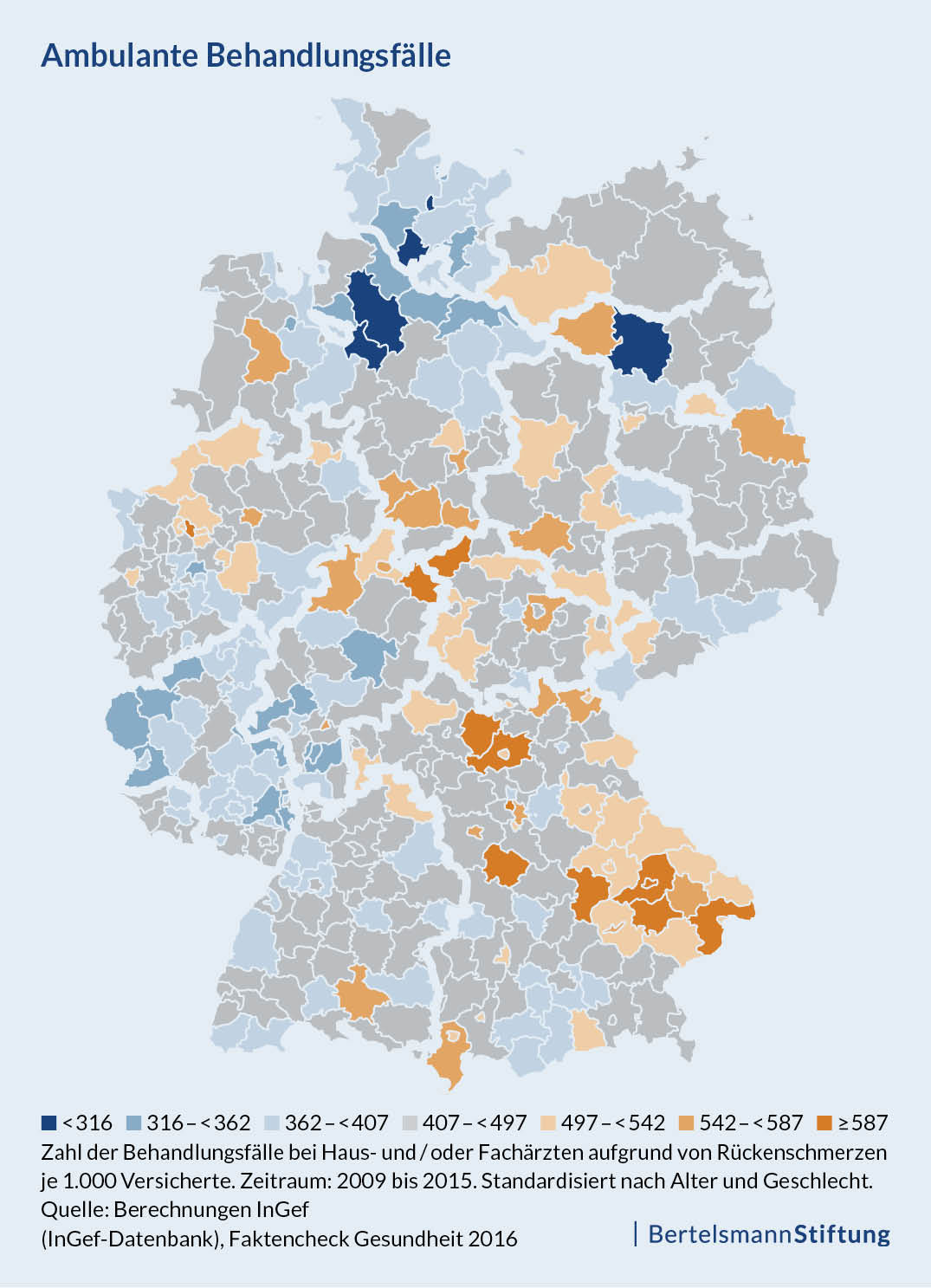 Betroffene mit Rückenschmerzen gehen in Berlin oder Bayern viel häufiger zum Arzt als in Hamburg, Schleswig-Holstein und Rheinland-Pfalz. Die Zahl der Behandlungsfälle pro 1.000 Versicherten und Jahr variiert auf Bundeslandebene zwischen 370 in Hamburg und 509 in Berlin. Auf Kreisebene gibt es Unterschiede um mehr als das Doppelte: So betrug die durchschnittliche Anzahl von Behandlungsfällen je 1.000 Versicherten in den Jahren 2009 bis 2015 in den Kreisen Ostprignitz-Ruppin (BB) und Rotenburg/Wümme (NI) nur 306, im Werra-Meißner-Kreis (HE) dagegen 711 und in Dingolfing-Landau (BY) sogar 730 Fälle. Auch Ärzte agieren regional sehr unterschiedlich: Zwischen den Bundesländern variieren die Verordnungen von Röntgen-, CT-, und MRT-Aufnahmen um bis zu 30 Prozent. In manchen Stadt- und Landkreisen werden sogar doppelt so viele Aufnahmen veranlasst wie anderswo.
