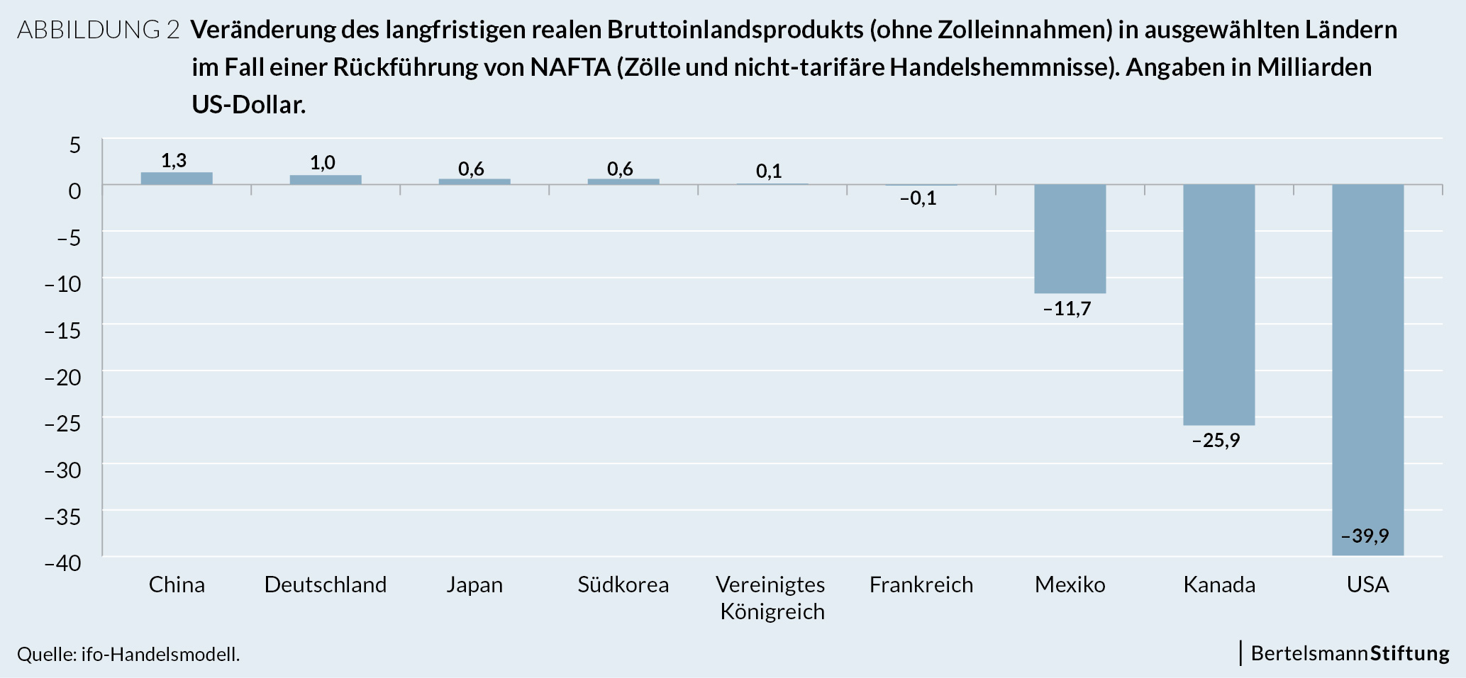 Schon die Wiedereinführung von Zöllen und nicht-tarifären Handelshemmnissen, zum Beispiel technische Auflagen, Dokumentationspflichten etc. in der nordamerikanischen Freihandelszone, zu der neben den USA, Kanada und Mexiko gehören, würde die amerikanische Volkswirtschaft schädigen. Langfristig würde das reale Pro-Kopf-Jahreseinkommen in den USA um rund 0,2 Prozent beziehungsweise 125 US-Dollar sinken. Nur in Kanada fiele die jährliche Einkommenseinbuße mit etwas mehr als 1,5 Prozent beziehungsweise rund 730 US-Dollar je Einwohner höher aus. Die damit verbundenen Einbußen des jährlichen BIP lägen in Kanada bei rund 26 Milliarden US-Dollar und in den USA bei 40 Milliarden US-Dollar.