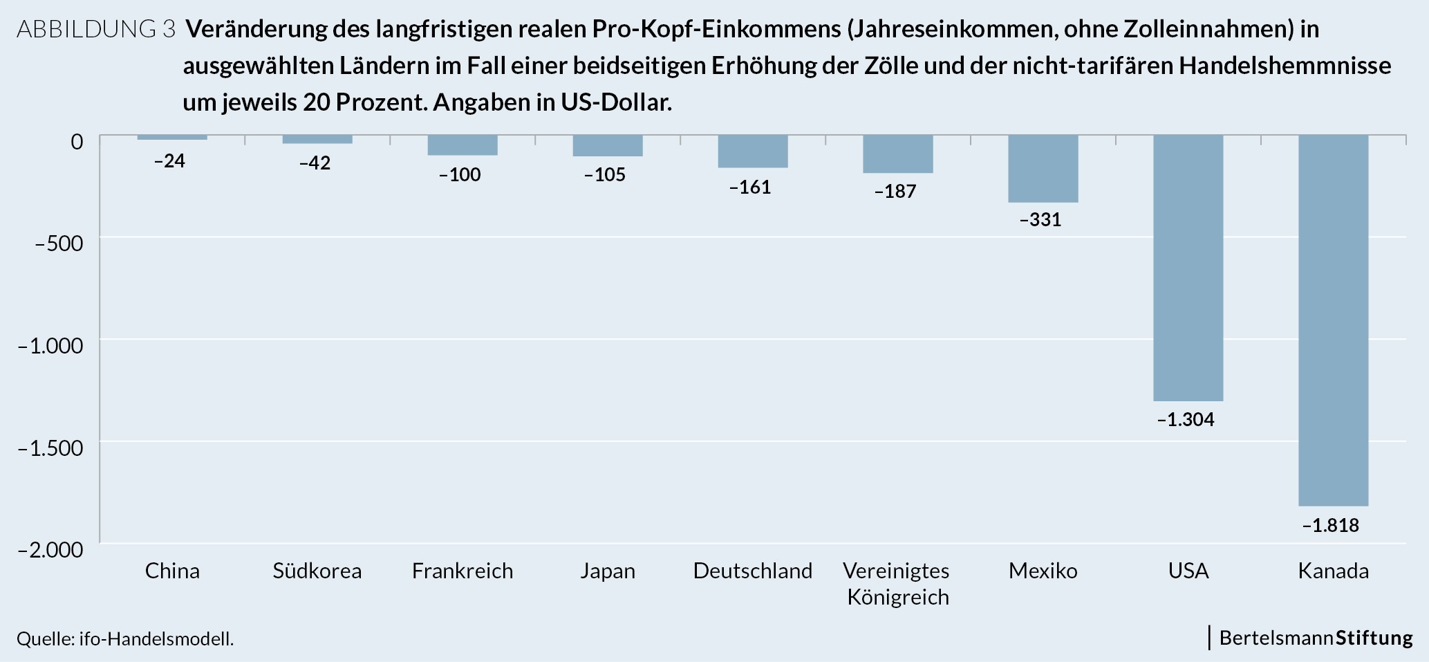 Sollten die übrigen Länder auf eine Abschottung der USA mit den gleichen Maßnahmen gegen die amerikanische Wirtschaft reagieren, würden die Einkommenseinbußen weiter ansteigen. Wird davon ausgegangen, dass alle anderen Länder ihre Zölle und nicht-tarifären Handelshemmnisse gegenüber US-Produkten ebenfalls um jeweils 20 Prozent erhöhen, würde dies den Handel zwischen den USA und dem Rest der Welt erheblich einschränken. Für die US-Importe werden – je nach Land – Rückgänge um 50 bis 60 Prozent berechnet. Die US-Exporte in die einzelnen übrigen Länder würden sogar um 70 Prozent und mehr sinken. Die Folge wären hohe Einkommenseinbußen: In den USA wäre das reale Pro-Kopf-Jahreseinkommen langfristig 2,3 Prozent beziehungsweise 1.300 US-Dollar geringer, in Kanada sogar 3,9 Prozent beziehungsweise rund 1.800 US-Dollar. Für Deutschland wäre ein Einkommensverlust in Höhe von 0,4 Prozent beziehungsweise rund 160 US-Dollar je Einwohner zu erwarten. Die langfristigen jährlichen BIP-Einbußen erreichen in Deutschland 13 Milliarden US-Dollar, in Kanada fast 65 Milliarden und den USA rund 415 Milliarden US-Dollar.