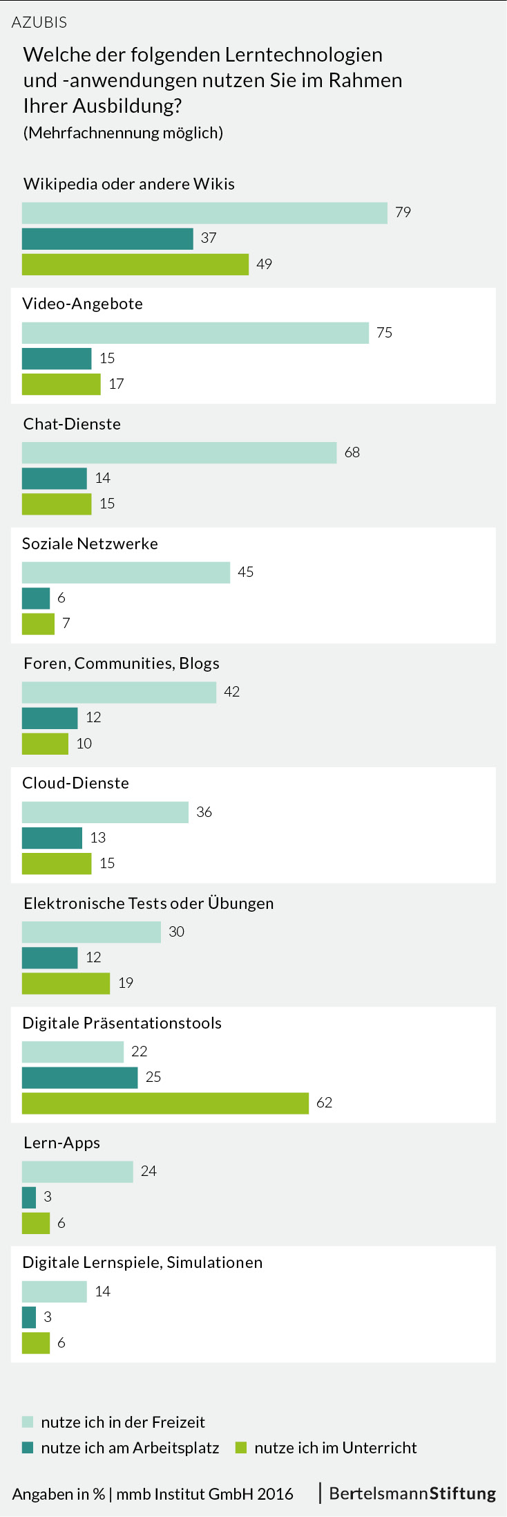 Die 1,34 Millionen Auszubildenden in Deutschland stehen der digitalen Welt sehr viel offener gegenüber als ihre Lehrer und Ausbilder. Berufsschüler setzen digitale Medien beim Lernen zu Hause wesentlich häufiger ein als im Unterricht oder im Betrieb. Das gilt für Wikis (79 Prozent aller Azubis) und Video-Angebote (75 Prozent) ebenso wie für Chat-Dienste (68 Prozent) oder soziale Netzwerke (45 Prozent). In Berufsschule und Betrieb hingegen werden lediglich Wikipedia und andere Wikis von einem nennenswerten Teil der Schüler angewendet (49 Prozent beziehungsweise 37 Prozent), alle anderen digitalen Technologien bleiben zum Teil deutlich unter 20 Prozent. Einzig digitale Präsentationstools kommen im Unterricht häufiger als zu Hause zum Einsatz. Viele Auszubildende wünschen sich von ihrer Berufsschule einen stärkeren Einsatz digitaler Medien. 93 Prozent der Berufsschüler sprechen sich für einen sinnvollen Mix aus digitalen und analogen Angeboten aus. 85 Prozent sagen, Lehrer sollten "häufiger etwas Neues mit digitalen Medien ausprobieren."